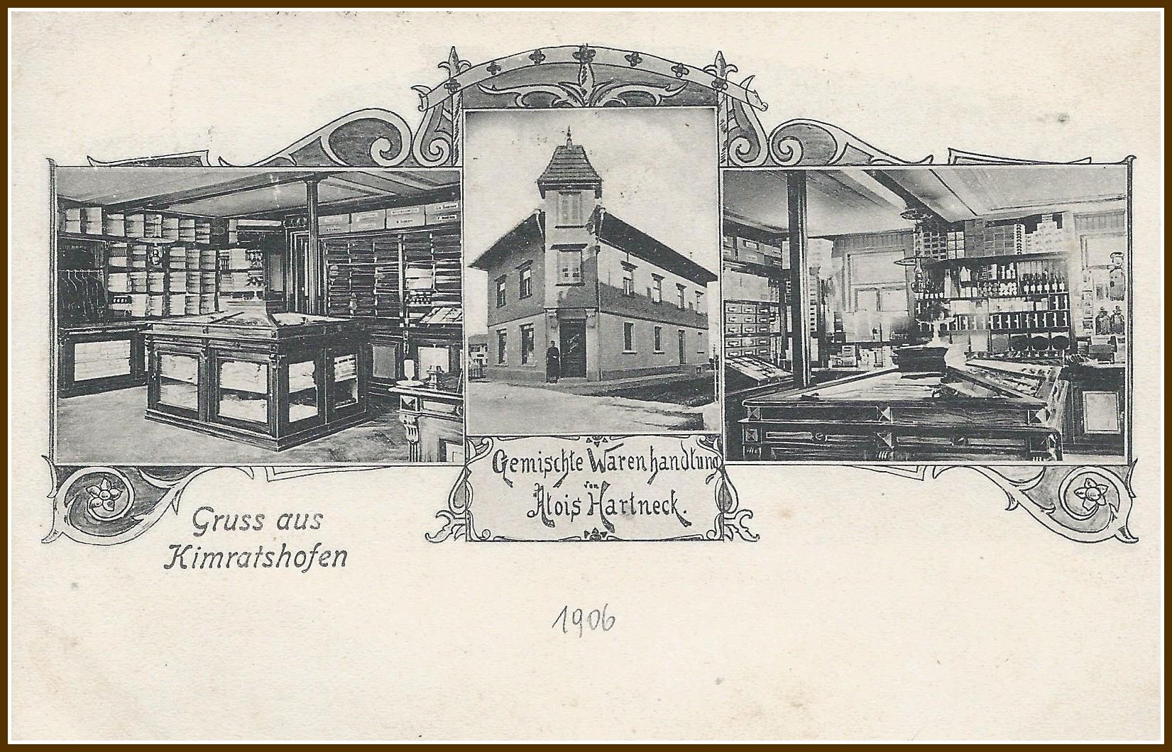 Die Postkarte erlaubt einen Einblick in die Welt des Handels um 1906. Eine Verpackungsindustrie gab es noch nicht. Zum Verkauf wurden die Waren in Tüten geschaufelt oder in Papier gewickelt oder in Gefäße gegossen. Damit genug Platz für das Vielerlei da war, ließ Alois Hartneck auf Maß Regale, Schränke und Theken um eine Insel in der Mitte herstellen.