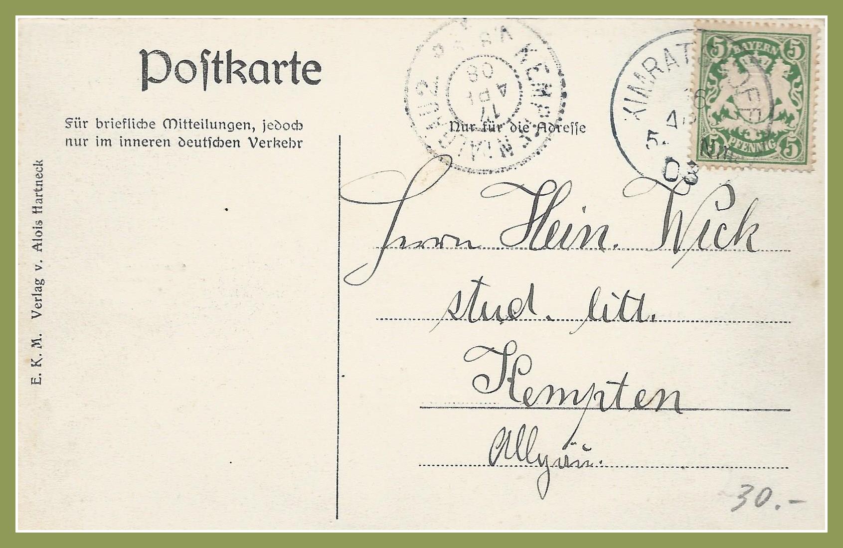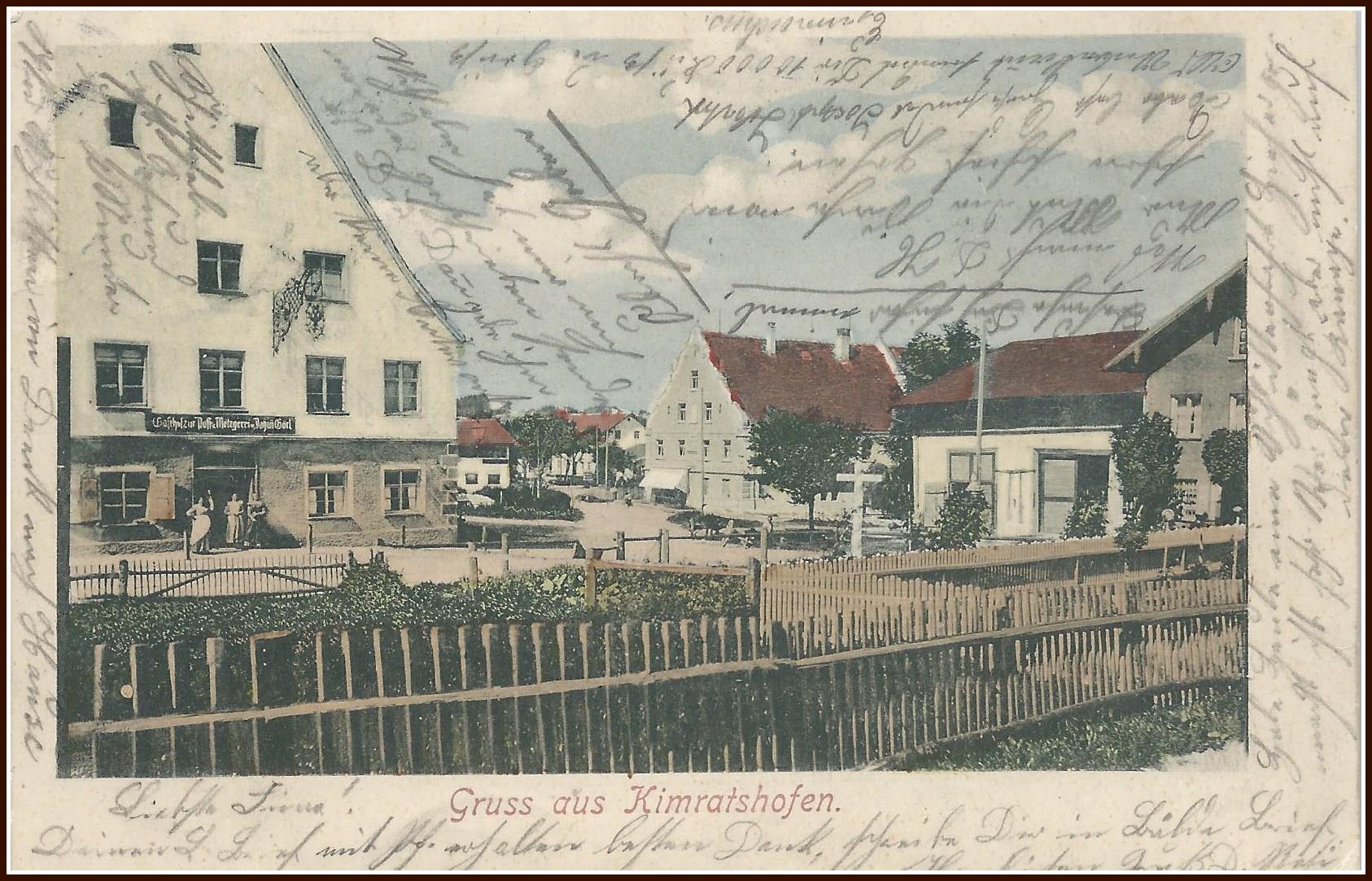 Vier Gebäude sind erkennbar. Rechts die Alte Post. Die Gaststube mit Fensterläden. Runde Kränze erinnern an einen Festtag. Vor der Post sechs Pfosten zum Anbinden der Pferde. Zur Rechten sieht man noch das Thanner Haus mit den Mansarden, dahinter das Finsterlin Haus. Zur linken Seite das Maler Konrad Haus im Allgäuer Stil mit einem flachen weit überstehenden Dach.