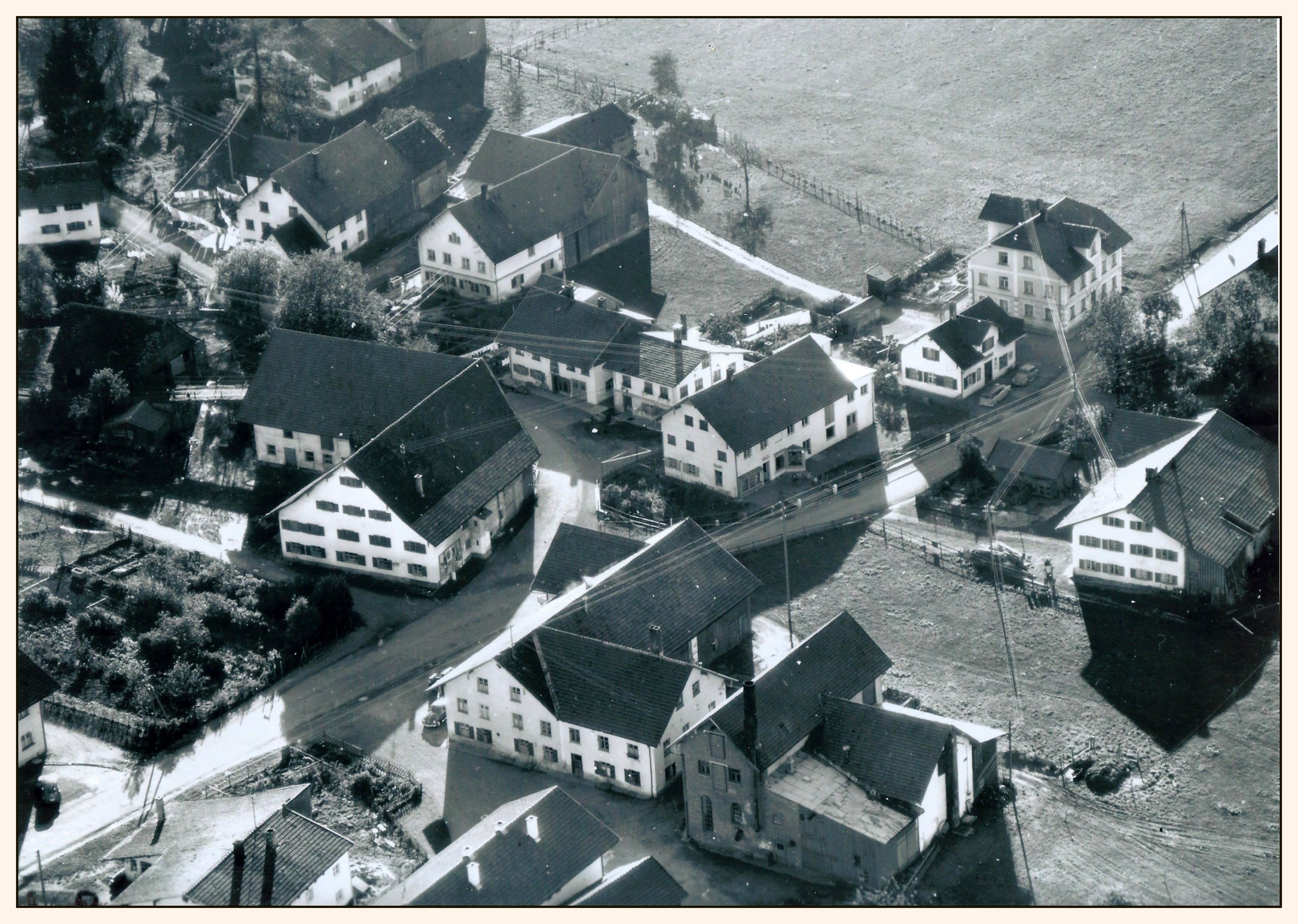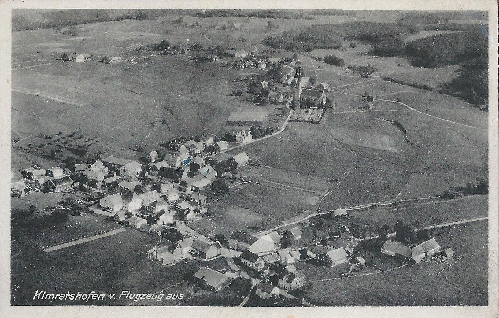 Franz Feldmeier fliegt über Kimratshofen. Man erkennt das Fässle mit Brauhaus, das Greuter Haus, die Polsterei Schugg, früher Haushaltswaren Kalhorn, Gemischtwaren Glöggler und die Gendarmerie. Von oben: Rothärmel Hof, ehemalige Schmiede, Steinhauser, ehemals Schugg und Endres Hof, heute EVG.