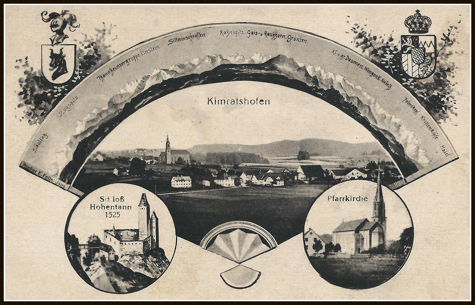 Vom Ort Kimratshofen kann man das Gebirge nicht sehen, denn nach Süden versperren hohe Hügel die Sicht. Man muss schon auf den Kirchturm in Oberhofen steigen, um die Allgäuer Alpen zu sehen. So hat E. Felle aus Isny recht kunstvoll ein Alpenpanorama im Bogen gezeichnet, dazu die ehemalige Burg Hohenthann, die Kirche St. Agatha und zwei Wappen. Wer das Gebirge sehen will, kann auch auf den Schweineberg, ein fast baumloser Wiesenhügel gleich in der Nähe, steigen und im Süden über Mittelberg die Alpen sehen.