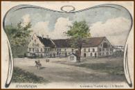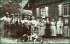 In der Waldstraße ist das Haus des Schmiedes. Auf der Ostseite des Hofes ist eine Schmiedewerkstatt angebaut. Vor dem Haus steht der Schmied mit seiner Frau. Ein Bauer hält sein Pferd zum Beschlagen bereit. Auf die hölzernen Räder müssen eiserne Reifen aufgezogen werden.