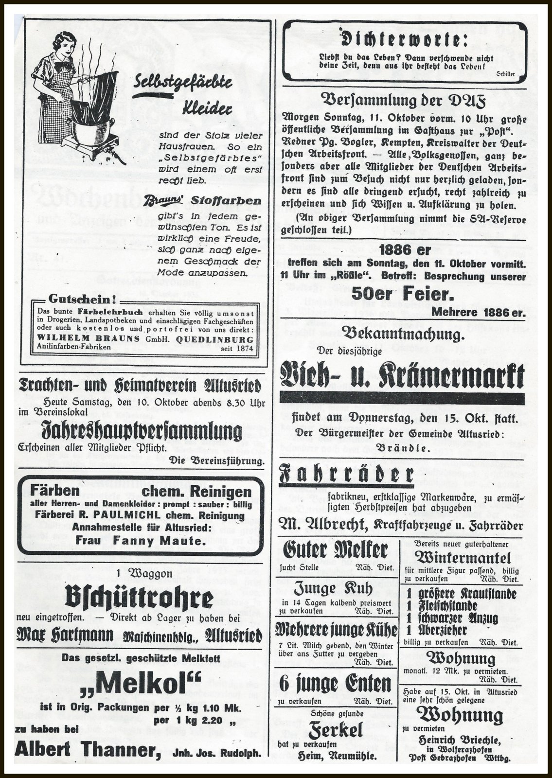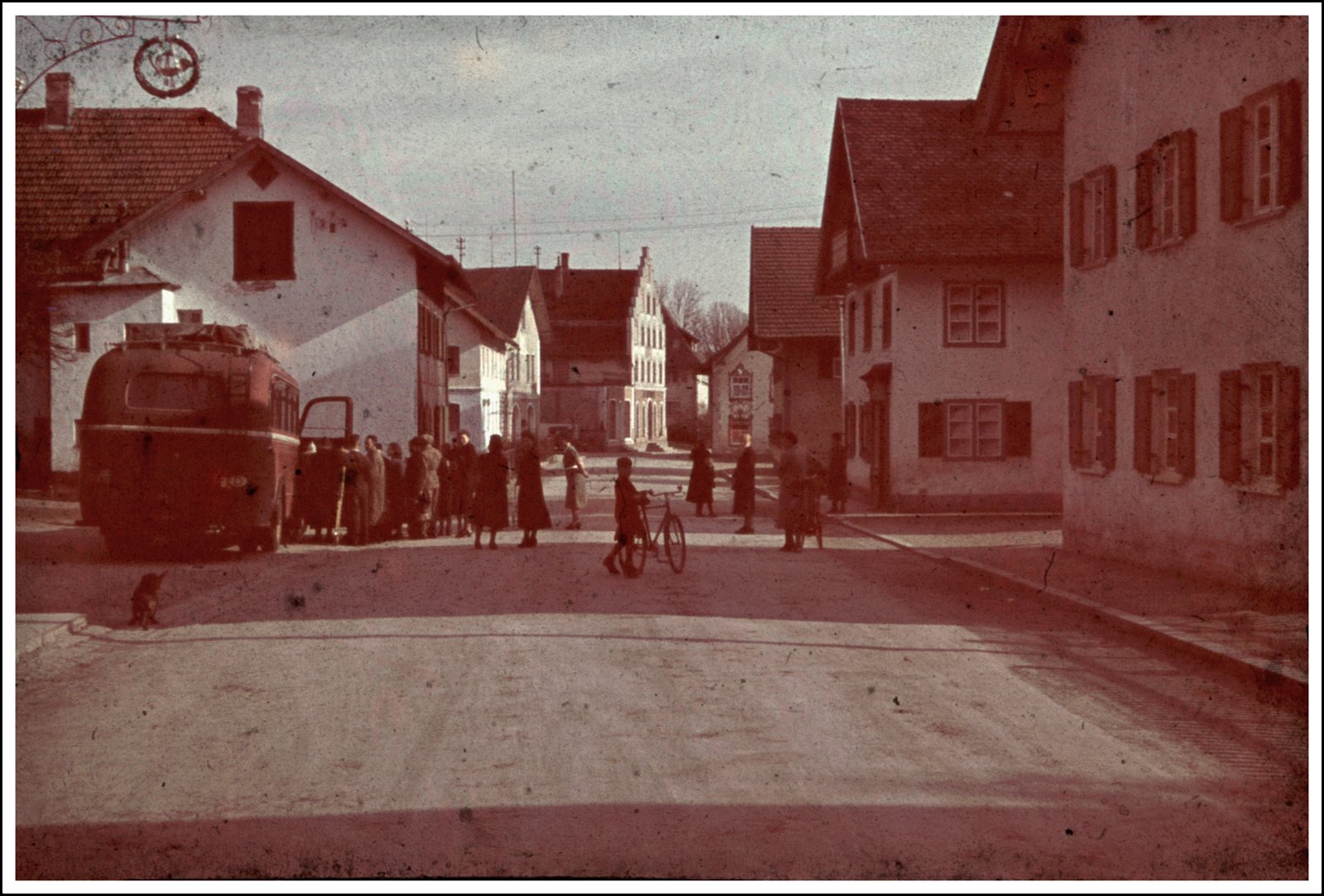 Franz Joseph Wörz, der Vater von I. Hartmann, hat aus den Vierzigerjahren Farbdias hinterlassen. Sie zeigen noch das alte Altusried. Kein Auto ist zu sehen. Die Fußgänger gehen mitten auf der Straße. Sieben Häuser in der Hauptstraße wurden seitdem abgerissen. Die vielen Jahre, die vergangen sind, haben den Dias stark zugesetzt.
