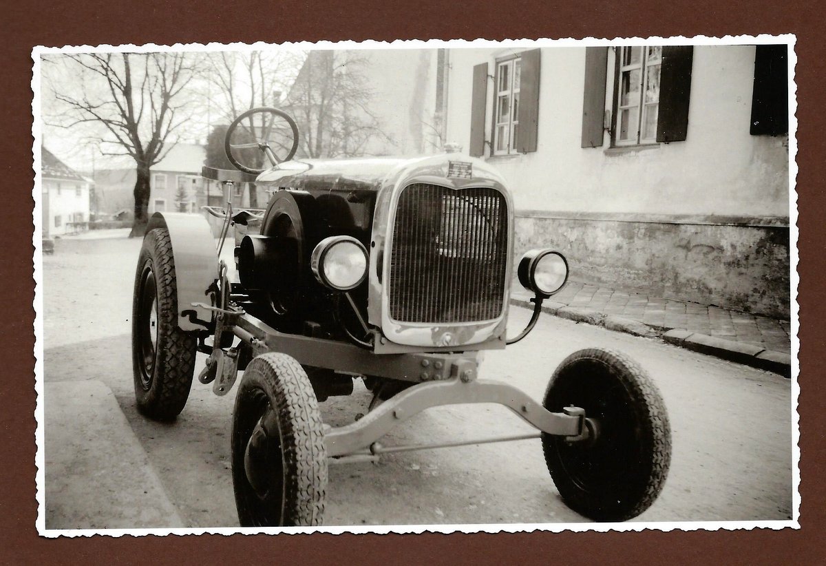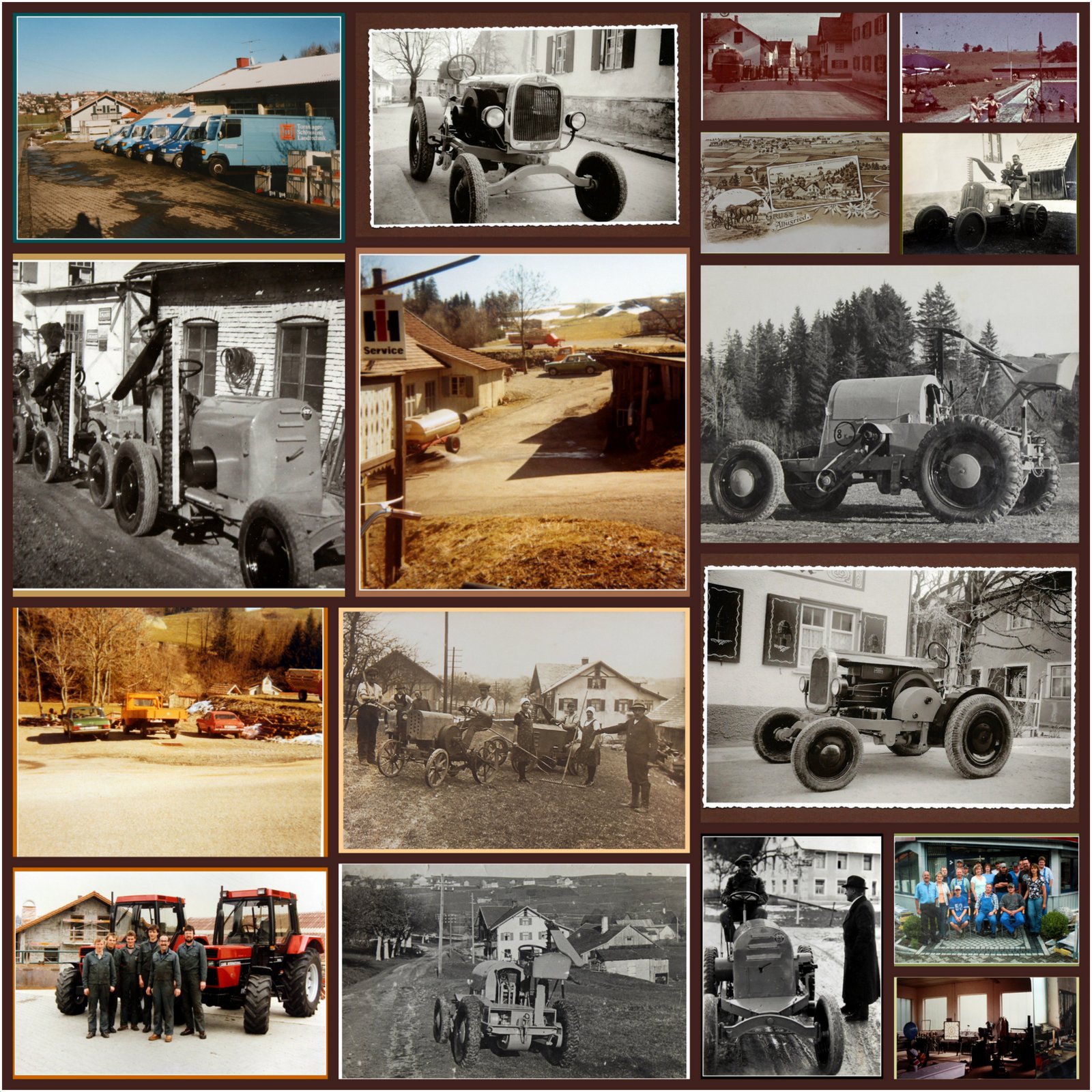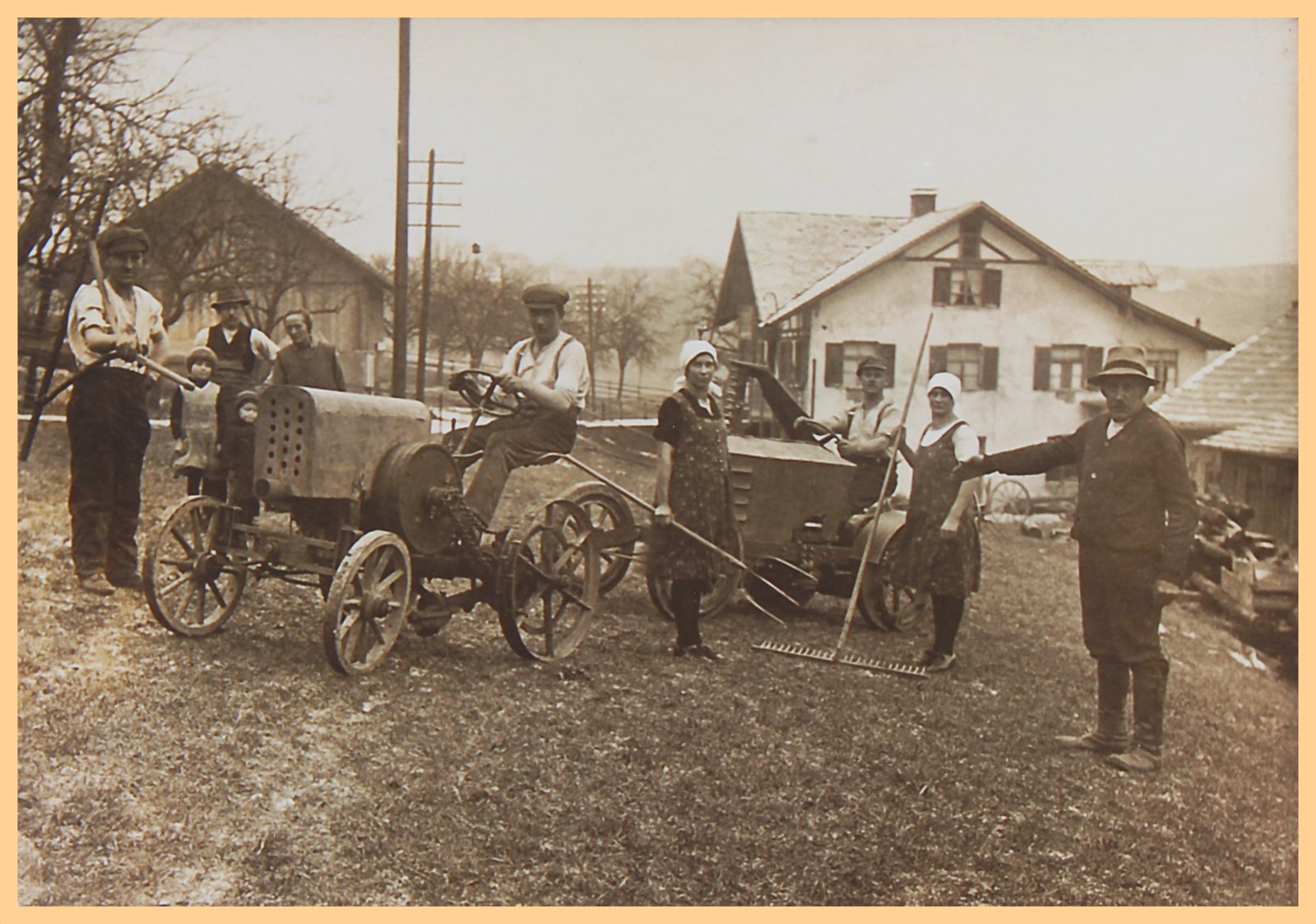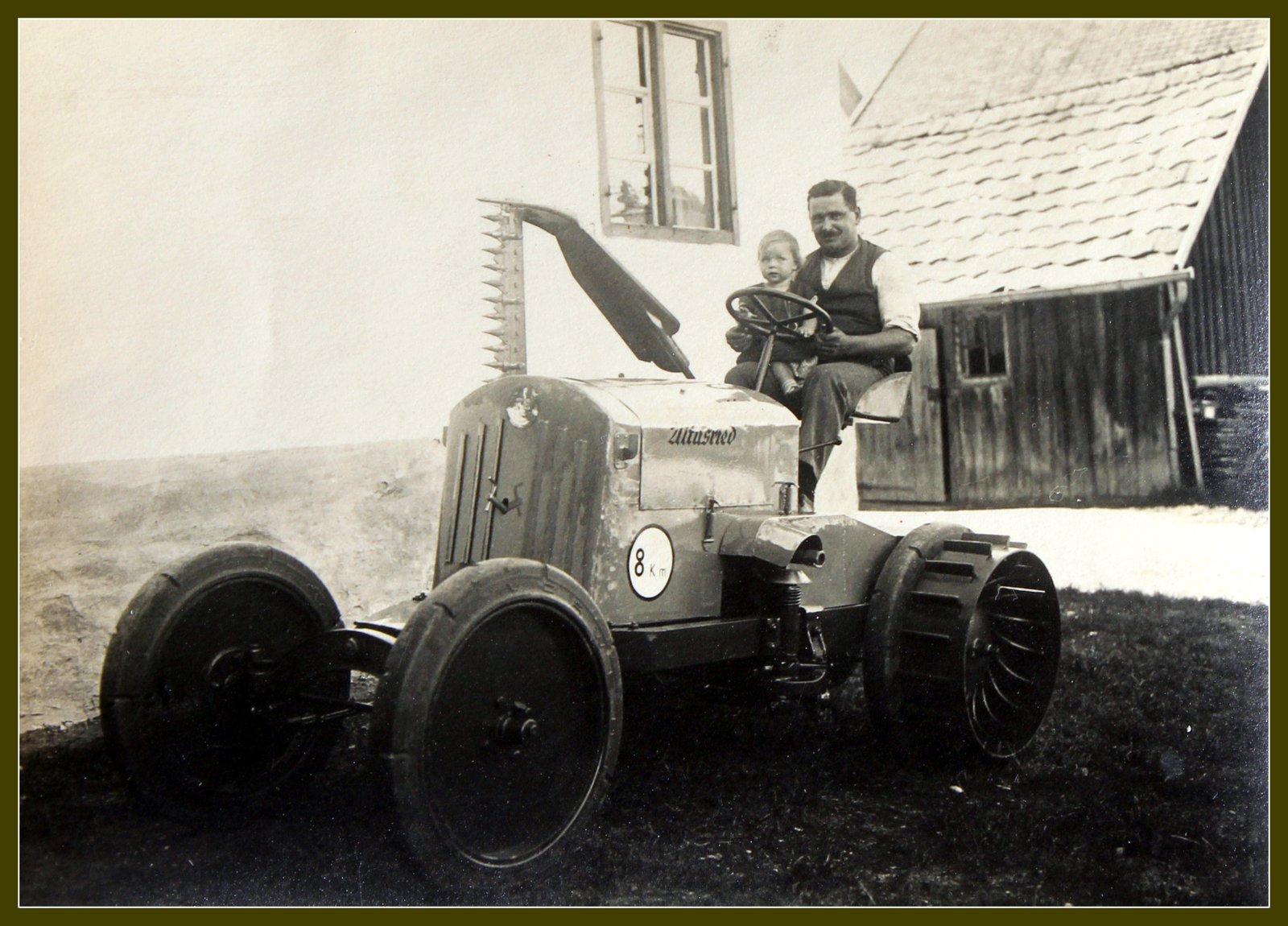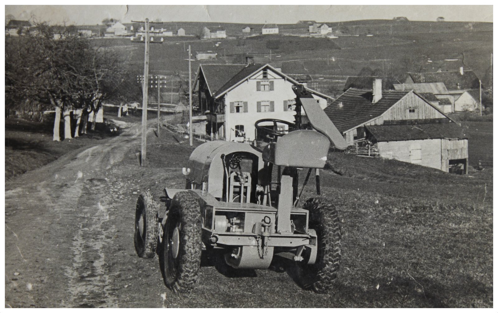Ein Weltsieger mit Mähwerk steht vor Wohnhaus und Werkstätte. Die Straße ist noch nicht asphaltiert, am Straßenrand Apfelbäume mit weiß gekalkten Stämmen. Im Hintergrund der Ort Altusried, noch ohne Neubaugebiete. Die Magnuskapelle auf freier Wiese. In den Dreißiger Jahren stellte Hartmann etwa hundert Weltsieger Traktoren her.