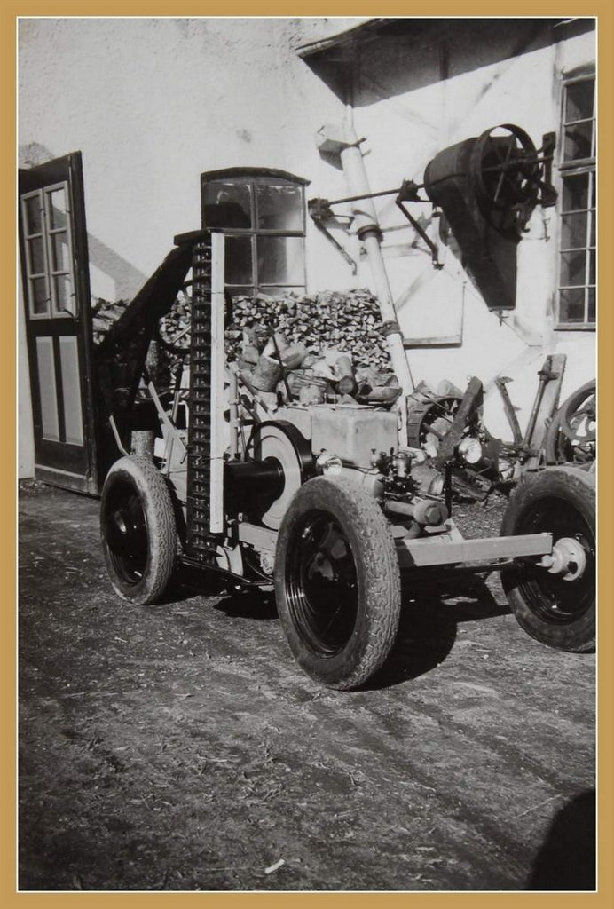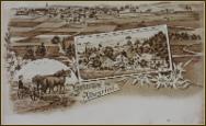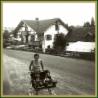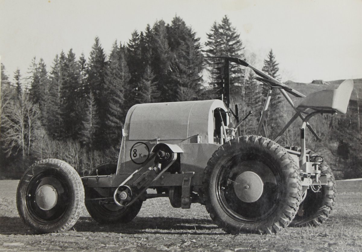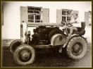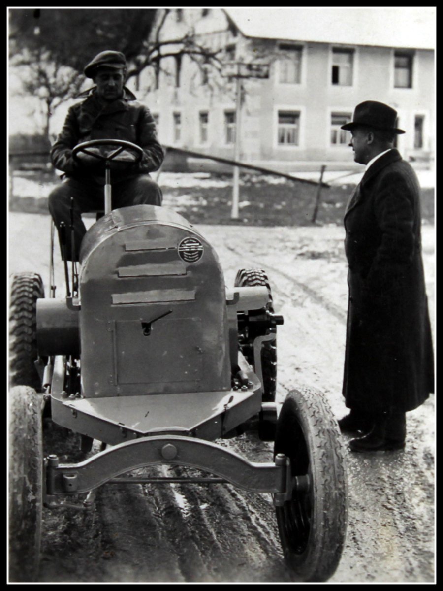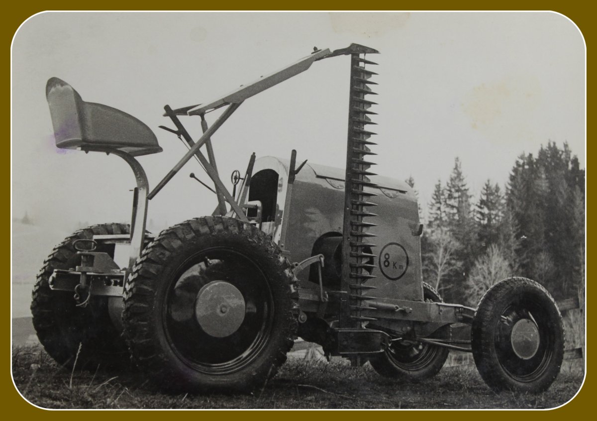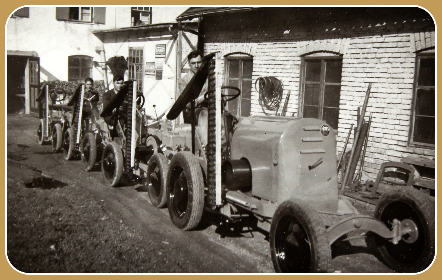 Ein Weltsieger mit Mähwerk steht vor Wohnhaus und Werkstätte. Die Straße ist noch nicht asphaltiert, am Straßenrand Apfelbäume mit weiß gekalkten Stämmen. Im Hintergrund der Ort Altusried, noch ohne Neubaugebiete. Die Magnuskapelle auf freier Wiese. In den Dreißiger Jahren stellte Hartmann etwa hundert Weltsieger Traktoren her.