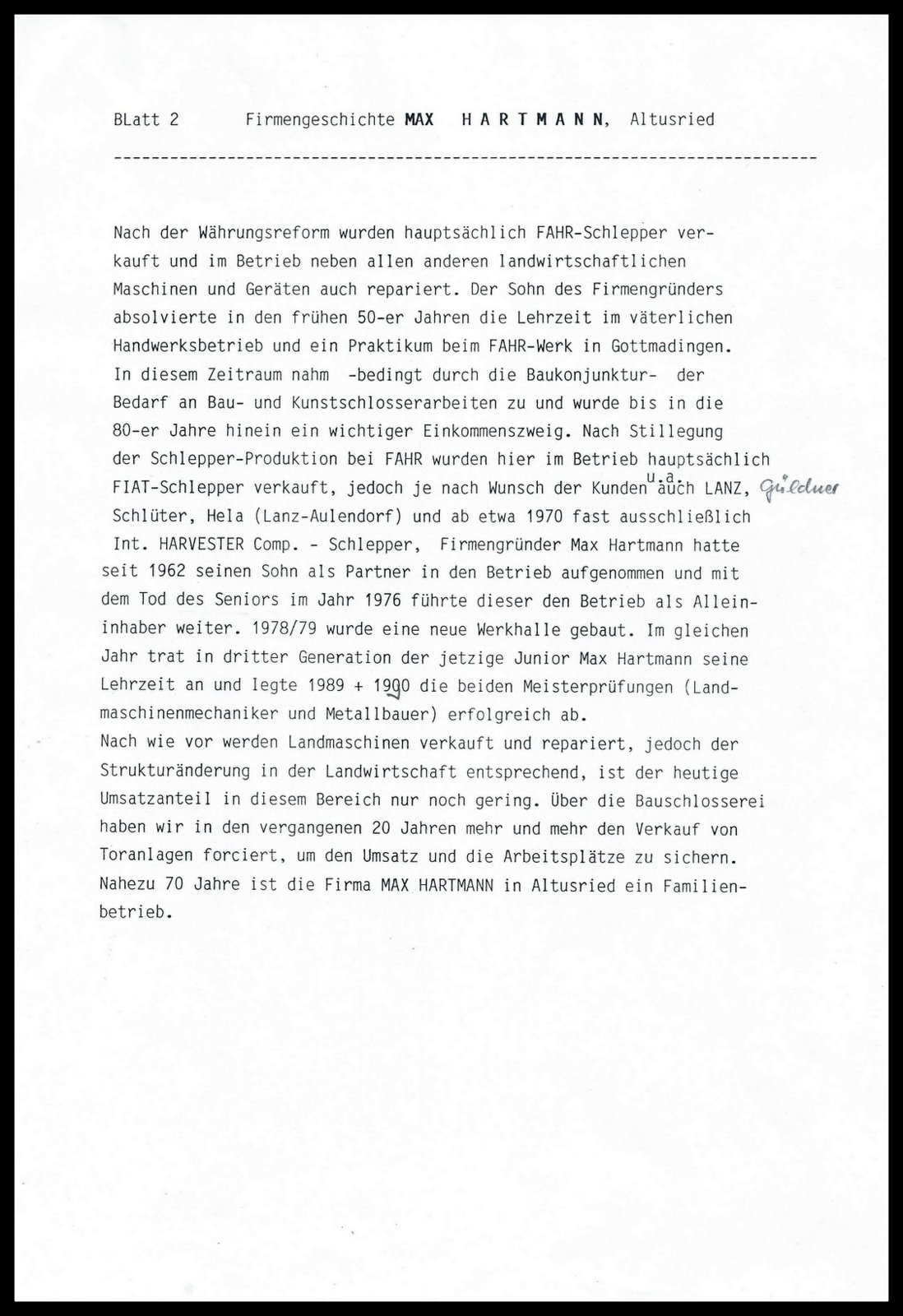 Im Jahre 1933 erwarb der Schmiedemeister Max Hartmann aus Ehingen Donauwörth die mechanische Werkstätte von Johann Pinzger "Im Tal" . Schwerpunkt war zu dieser Zeit bis zum Beginn des zweiten Weltkrieges der Traktorenbau, danach die Schmiedearbeit, Hufbeschlag, Handel und Reparatur von Landmaschinen.