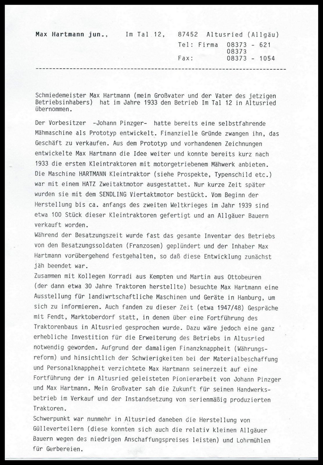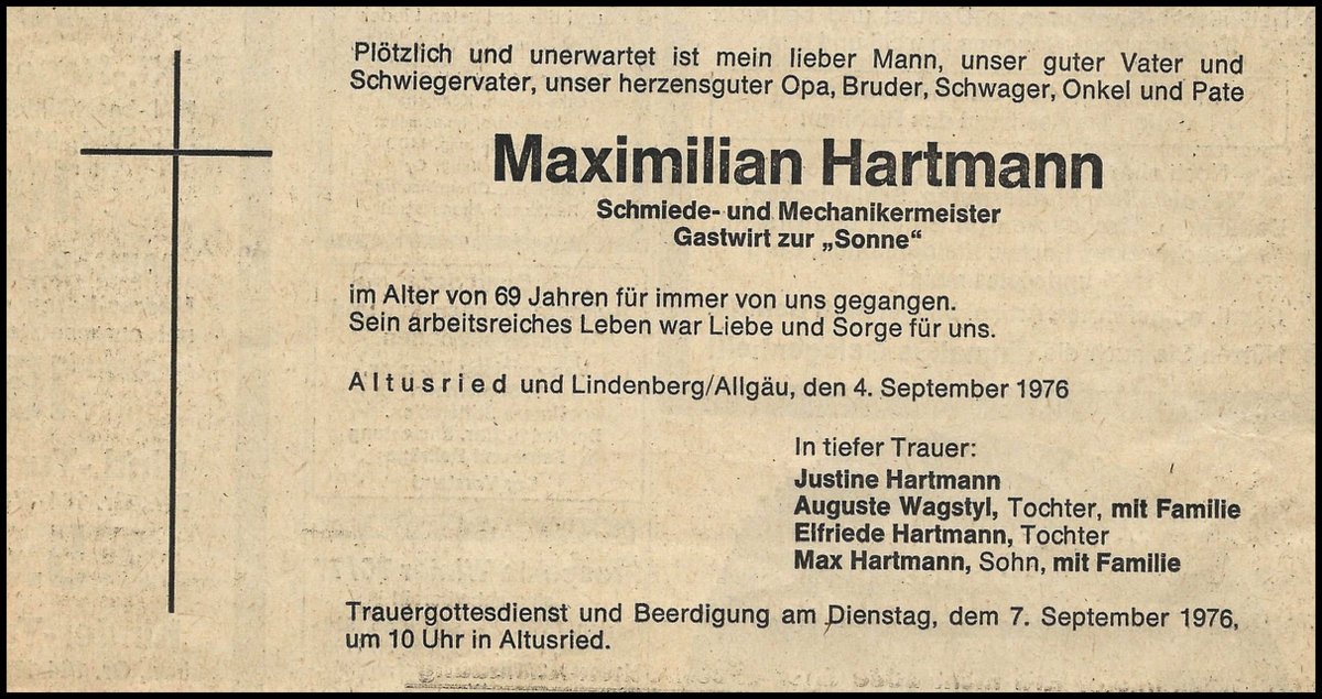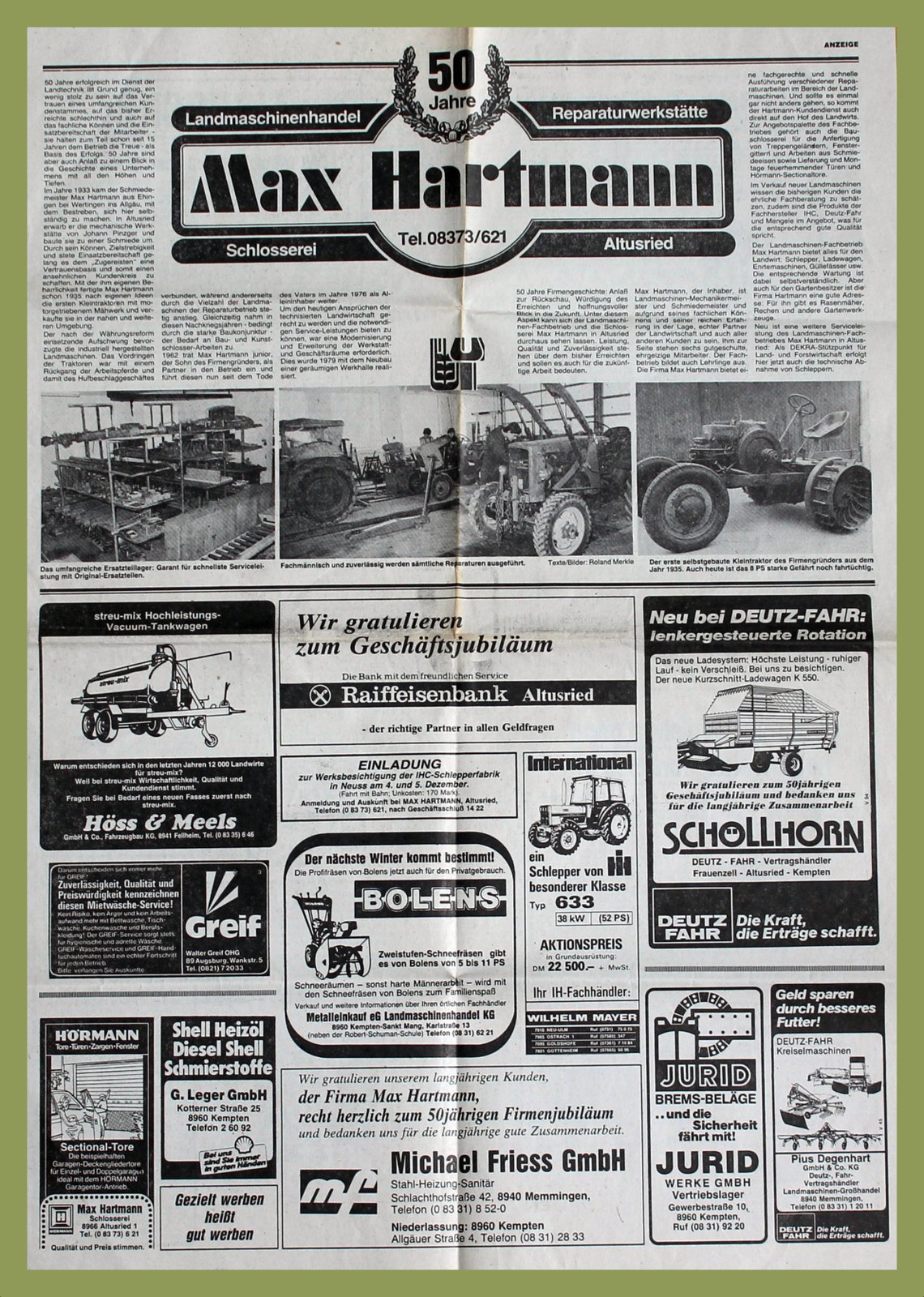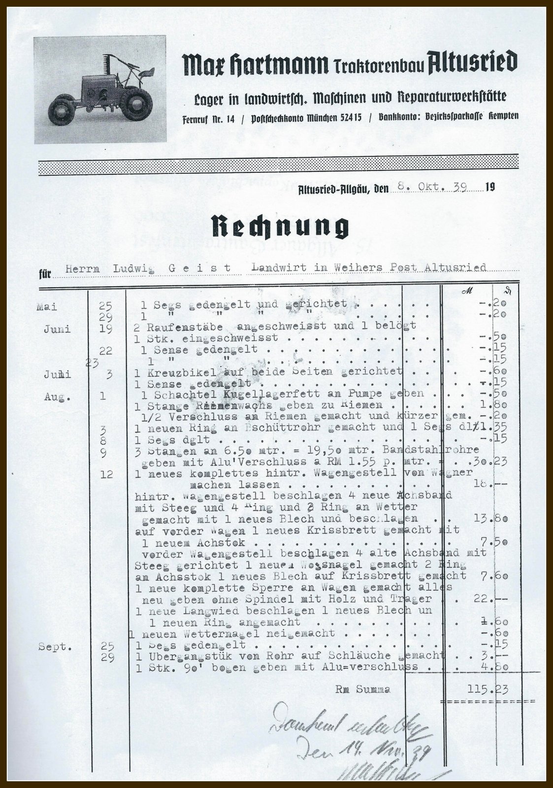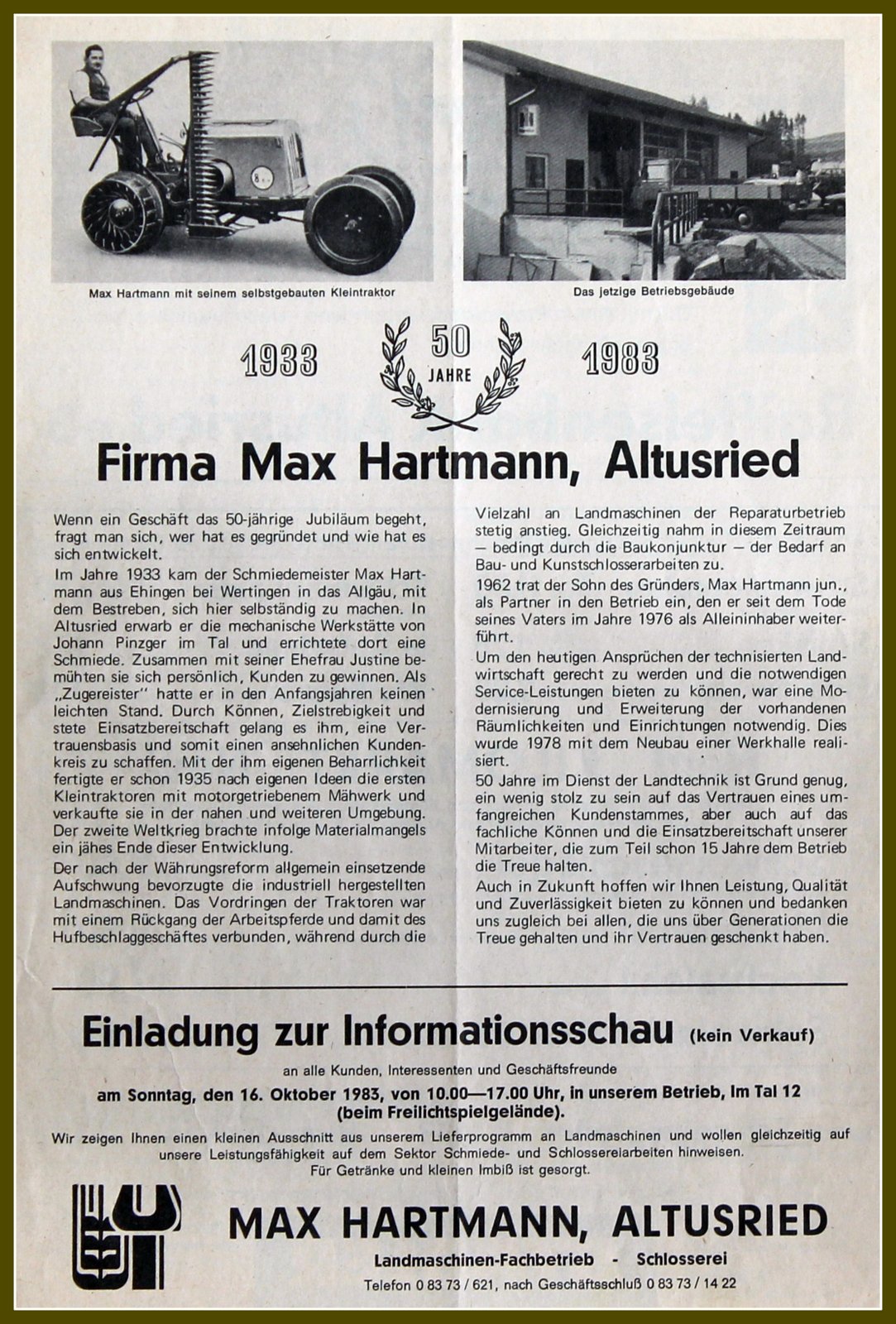 Max Hartmann hatte zwei Berufe. Er war Besitzer der Landmaschinen Firma und durch seine Heirat mit Augustine Natterer auch Wirt im Gasthaus zur Sonne. Das stellte sich als Vorteil heraus. Denn die Traktoren, die er im Tal produzierte, stellte er am Sonntag vor dem Gasthaus aus. So konnten die Altusrieder nach der Messe und dem Zuhören der amtlichen Bekanntmachungen ( durch den Gemeindediener Georg Burger ) die neusten Modelle besichtigen, bevor sie zum Frühschoppen einkehrten.