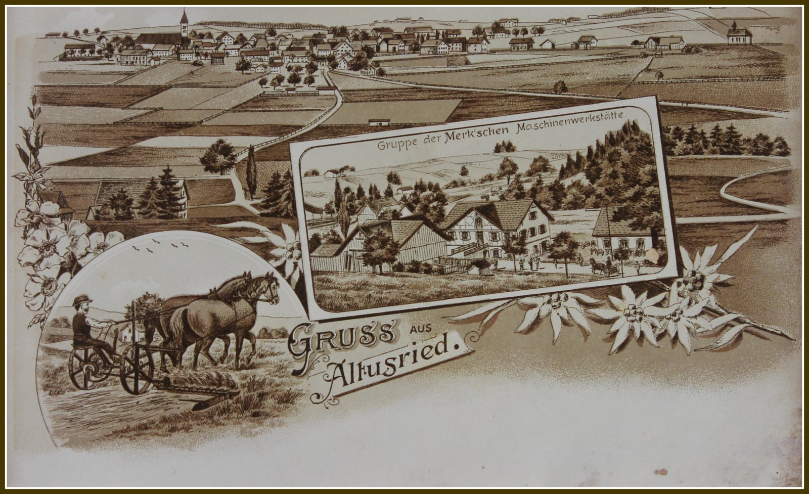 Die Vorgänger der Firma Hartmann waren Merk und Pinzger. An Merk erinnert nur noch eine Bildpostkarte. Die Merk'schen Werkstätten produzierten Mähmaschinen, die von Pferden gezogen wurden. Das war eine bedeutende Arbeitserleichterung für die Landwirtschaft. Nachfolger war Johann Pinzger, ein vielseitig begabter Unternehmer und Konstrukteur. Mit einer Turbine erzeugte er am Riedbach Strom und ermöglichte so die Elektrifizierung von Altusried. Außerdem konstruierte er Materialseilbahnen und baute 1926 die ersten Zugmaschinen mit Mähwerk. Doch nicht zuletzt durch die Weltwirtschaftskrise wurde anno 1931 das Unternehmen insolvent und Pinzger musste den Betrieb aufgeben.