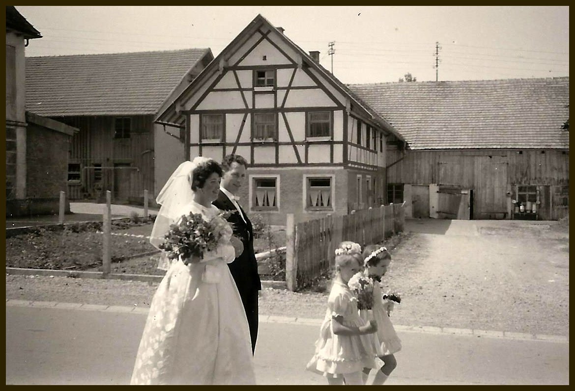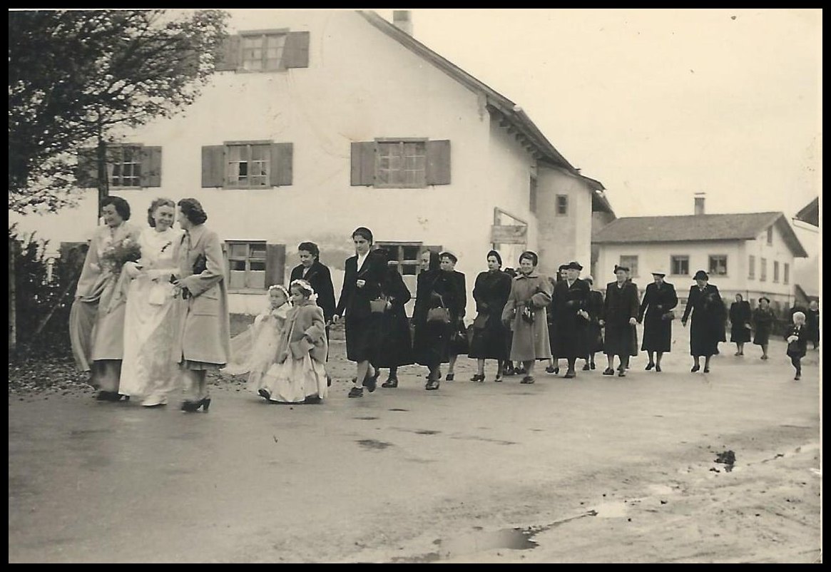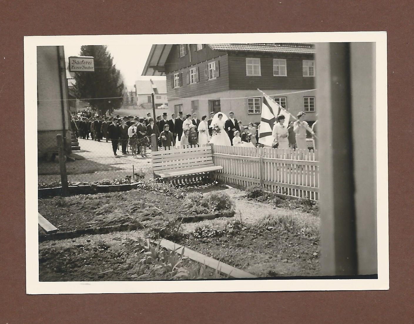 - Hochzeitszug vor dem Endres Haus, heute EVG , der Bräutigam fehlt noch .