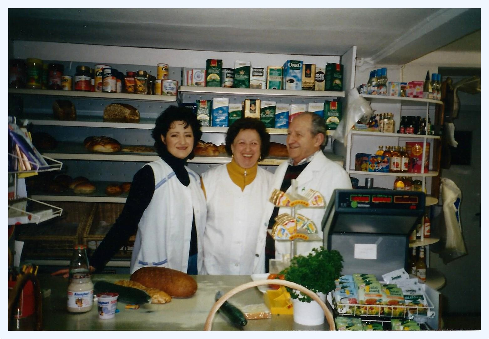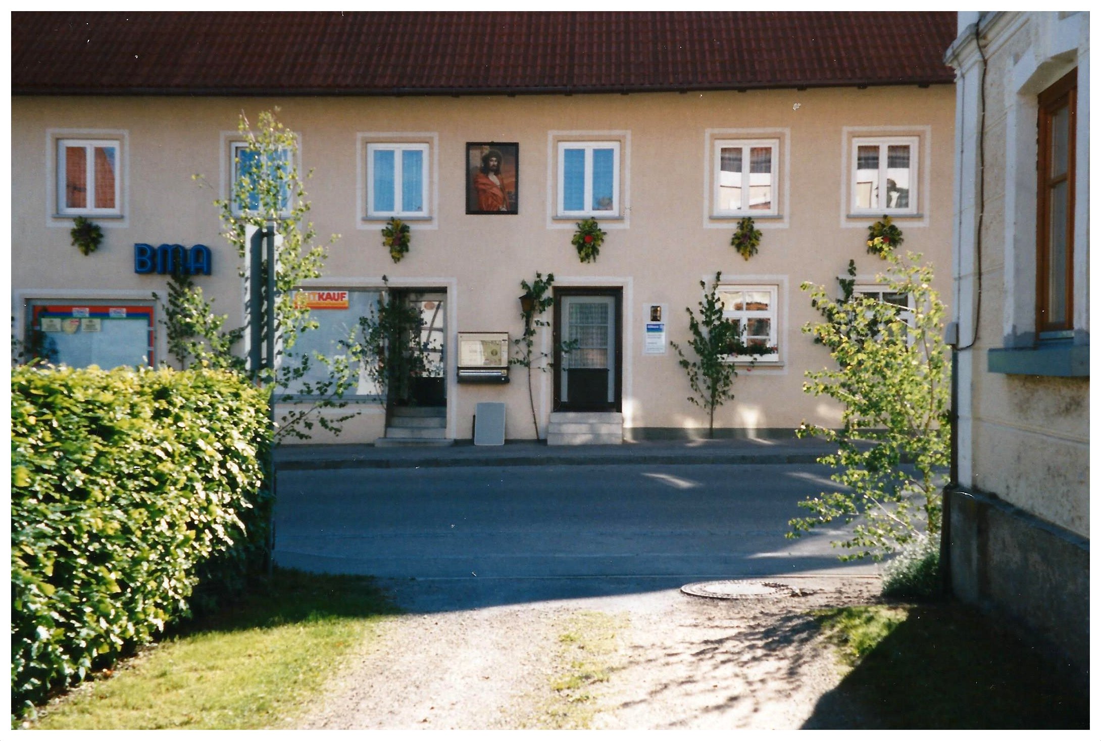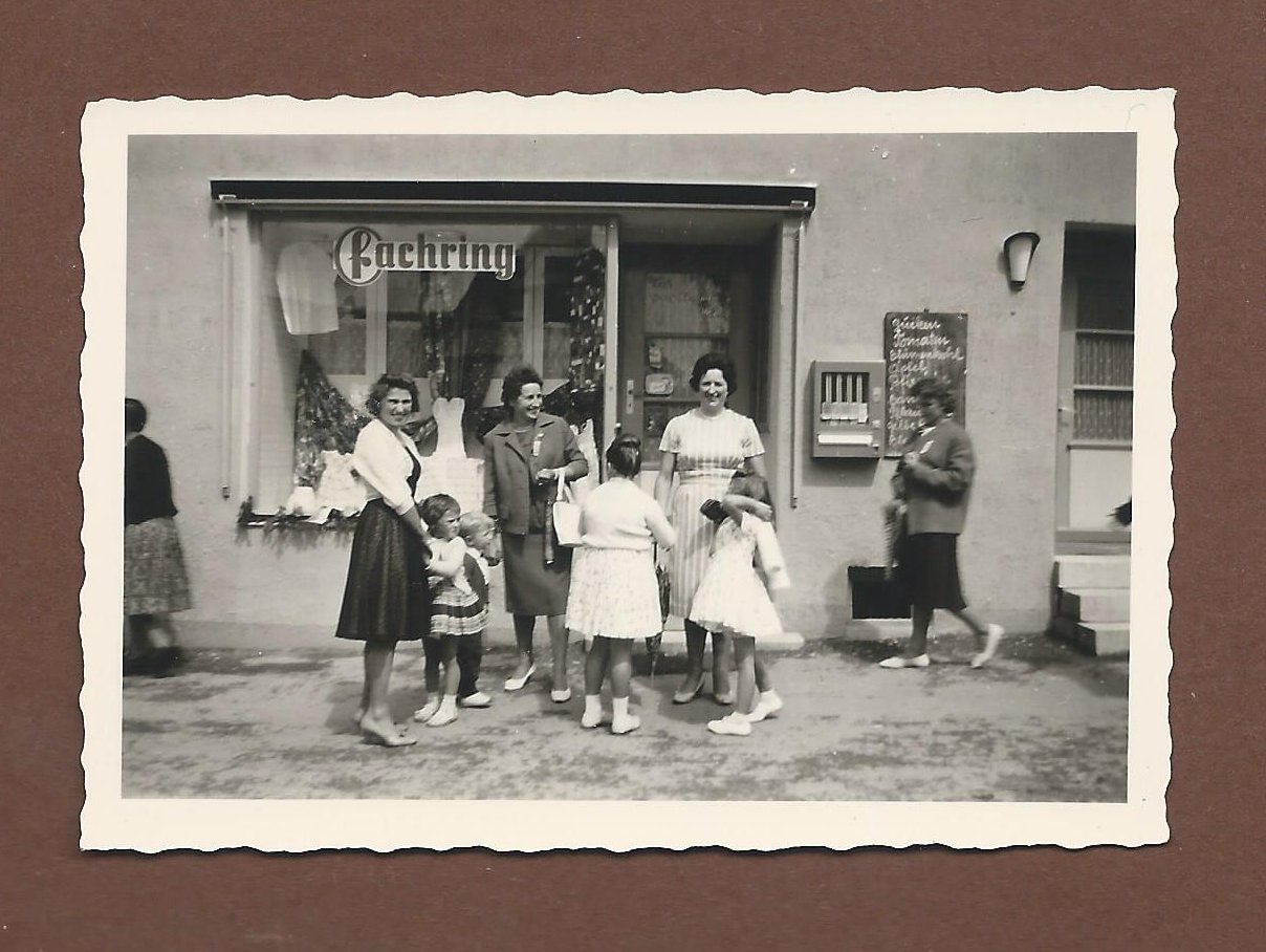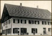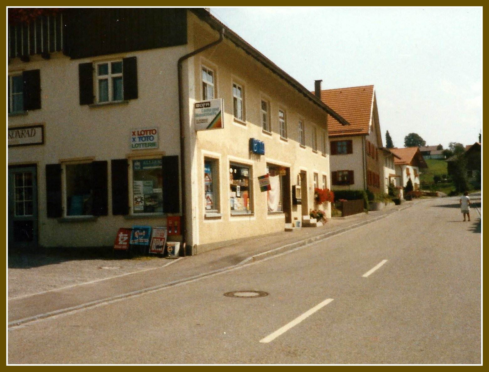 Maler Konrad Haus, Lebensmittelgeschäft, Werbung für Lotto, Toto, Lotterie, Bildzeitung, tZ- Zeitung, Schöller Eis, BMA und Allianz. Das zweite Haus links mit der verschindelten Westfassade ist die Bäckerei Bucher. - Im Lebensmittelgeschäft