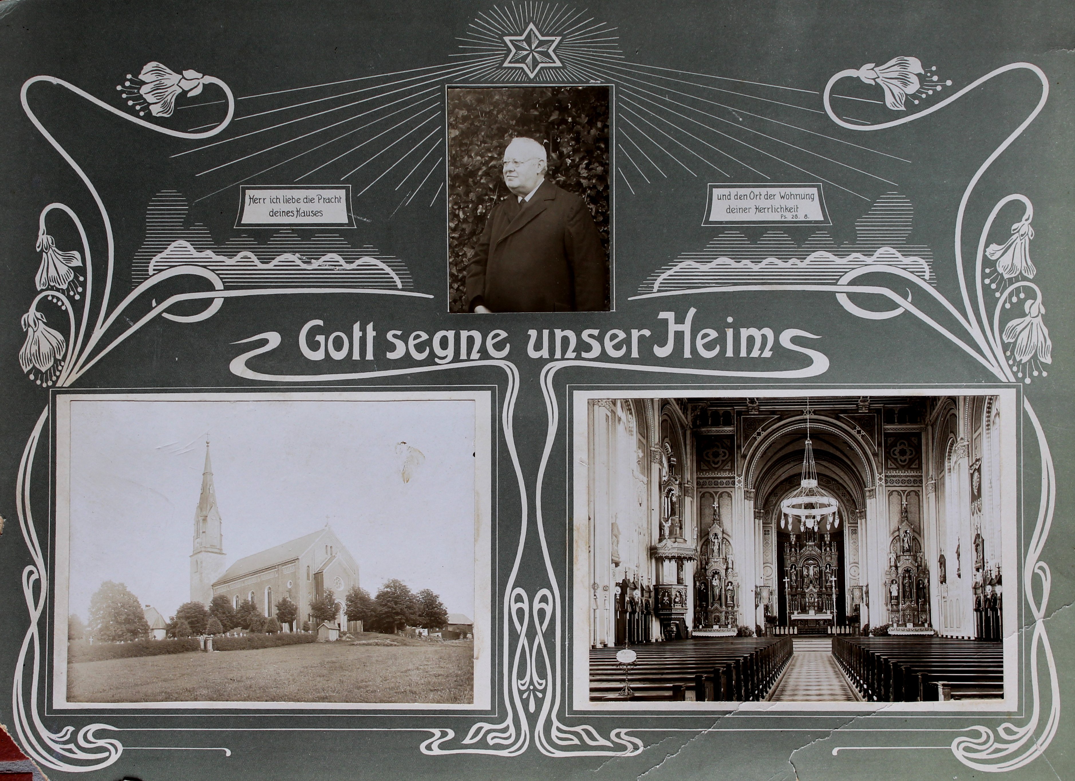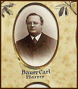 - Karton im Din A 3 Format mit Jugendstil Ornamenten , die Kirche in der ursprünglichen Fassung von außen und von innen, Pfarrer Carl Baur oben in der Mitte. Unter Carl Baur wurde der Kirchenneubau von 1886 vollendet.