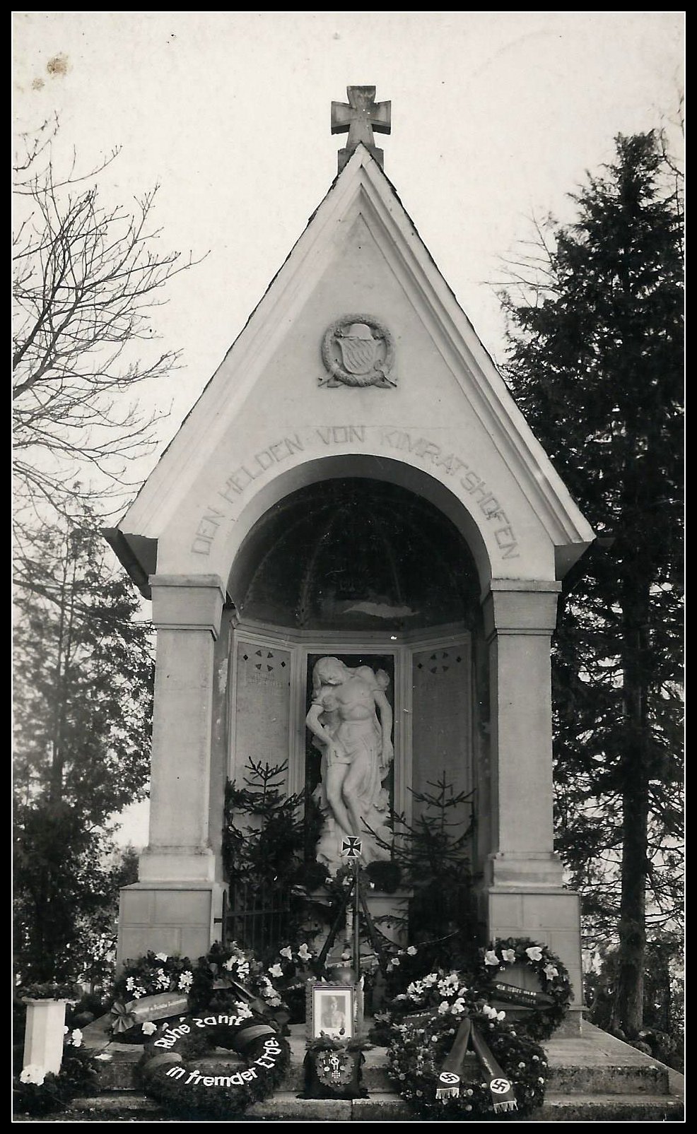 - Kriegerdenkmal in Kimratshofen, es ist Kriegszeit. Auf dem Kranz steht: Ruhe sanft in fremder Erde.