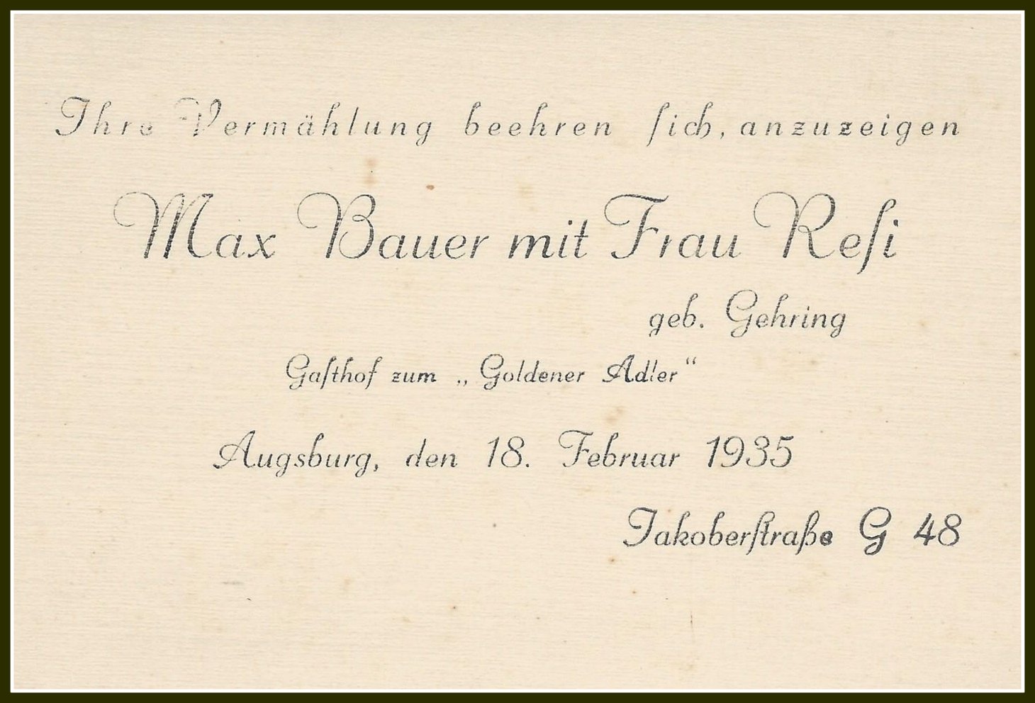 - Vermählungsanzeige von Max Bauer und Resi Bauer am 18. Februar 1935