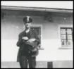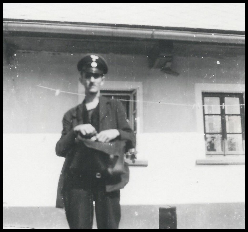 Postbote Bürzle mit Schildkappe, er zieht einen Brief aus der Ledertasche.