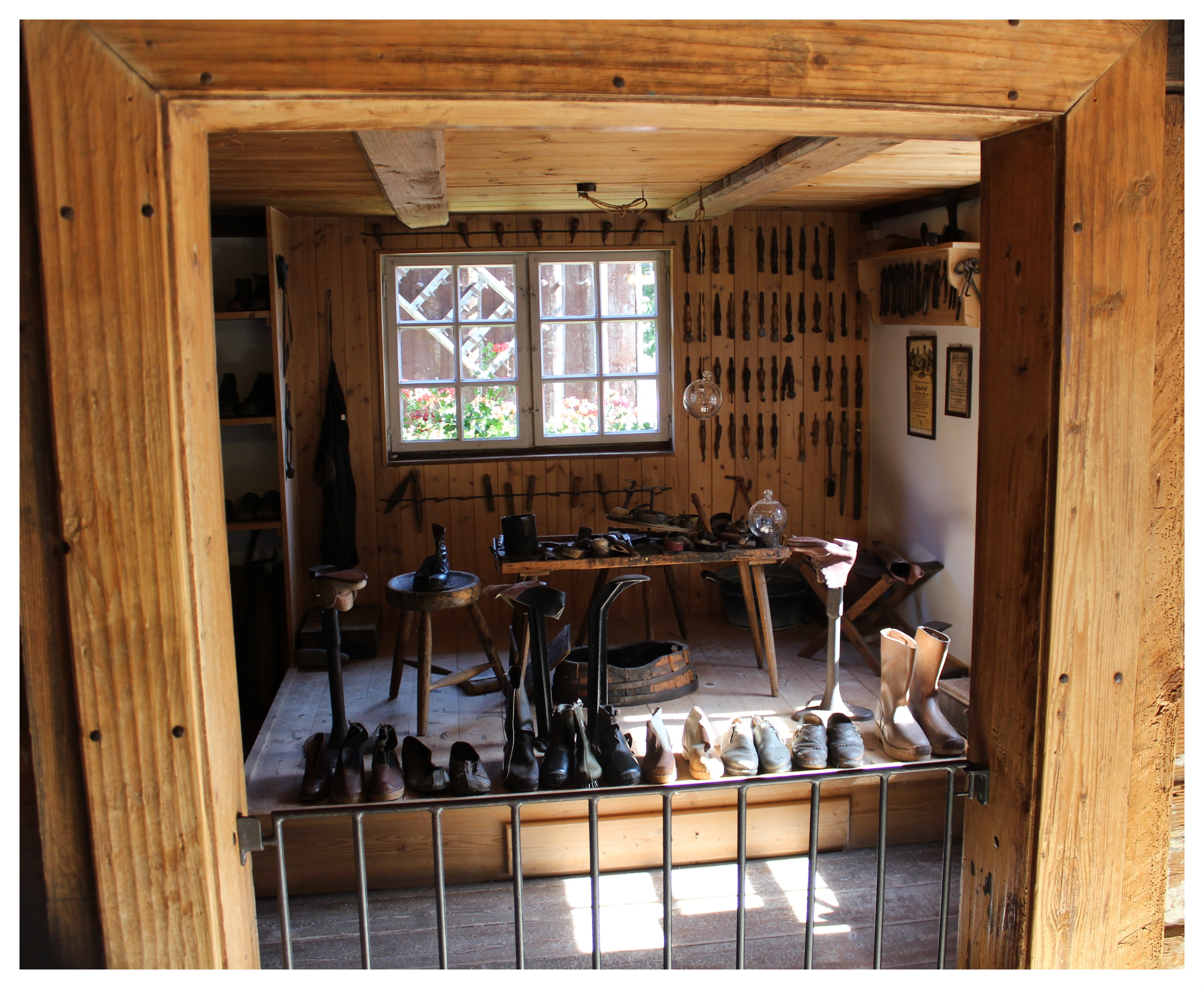 Der Beruf des Schuhmachers war ein wichtiges Handwerk. Auf der Rücksite des Fotos war vermerkt: Onkel Hans, Schuhmachermeister in Legau, 1936. Das 2. Bild zeigt eine Schuhmacherwerkstatt in dem Bauernhofmuseum Lautrach- Illerbeuren.