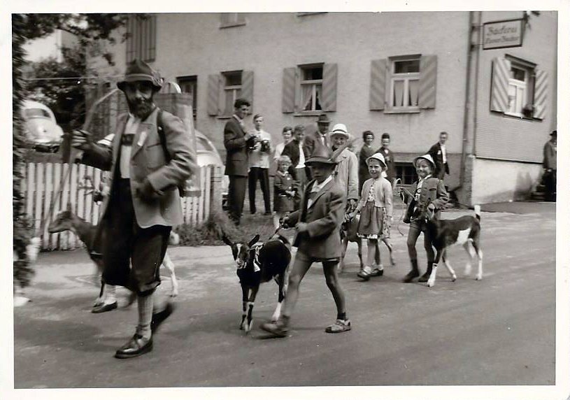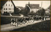- Festzug für das Schützenfest anno 1938, links der Mayer Hof, in der Mitte das Thanner Haus, die Kirchbergstraße ist noch nicht geteert.