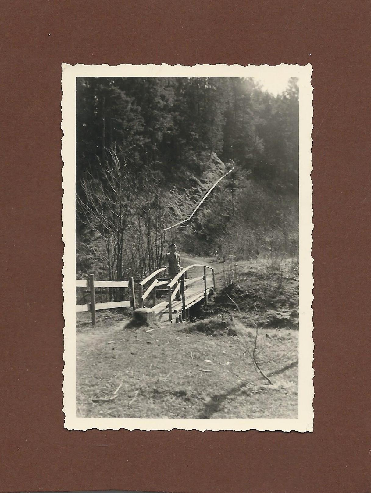 Vom Ort Altusried, vorbei am Sutterhof und Käferloh führt ein Fußweg hinunter nach Buch an der Iller. Stufen erleichtern das Gehen an dem steilen Hang und ein Geländer gibt Sicherheit. Eine Brücke überquert den Bach. Auf der Brücke steht ein Mann im Anzug. Heute ist es zumeist sehr einsam an der Iller. Nur selten trifft man einen Wanderer an. Aber nach wie vor ist die LEW als Bauherr der Staustufe verpflichtet, die Brücke und die Wege zu unterhalten.