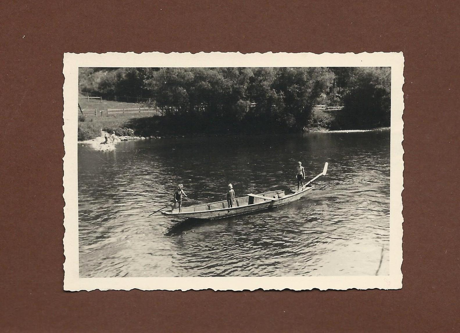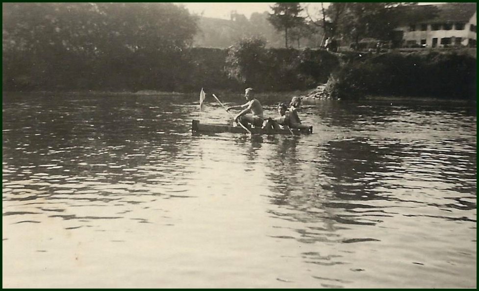 Vis a vis von Buch sehen wir am Westufer den Hof der Familie Endres mit dem alten Hofnamen Riedhanser, Foto aus dem Jahre 1942. Leider gibt es das Haus nicht mehr. Es wurde völlig abgetragen. Es ist Sommer, zwei Buben haben ein Schifflein gebaut und paddeln auf der Iller. Es sind Hans Dorn und Erwin Hörmann.