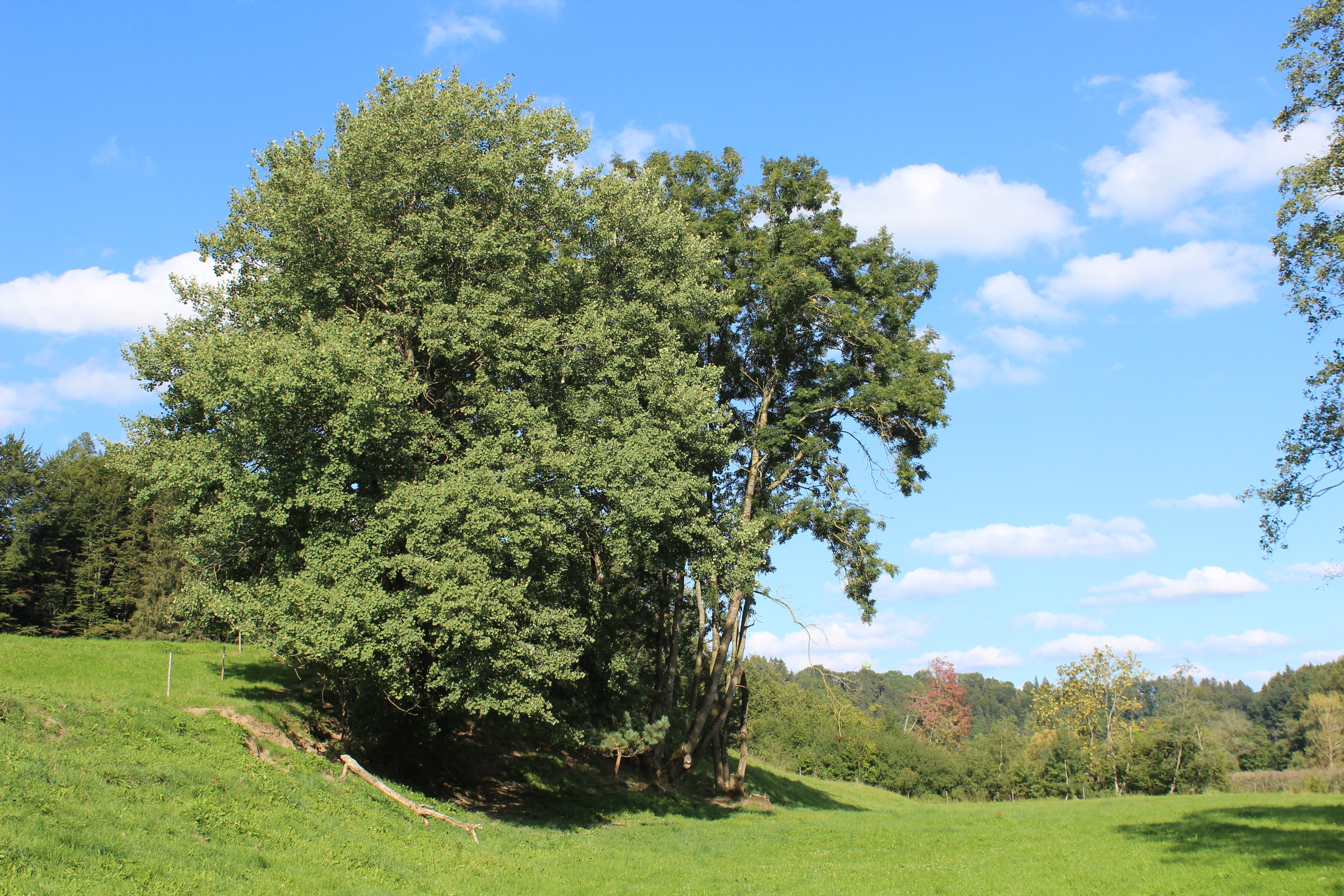 - Die Baumgruppe am ehemaligen Hof, hat die Zeit überdauert. Es wachsen Zitterpappeln, Eschen und eine Föhre.