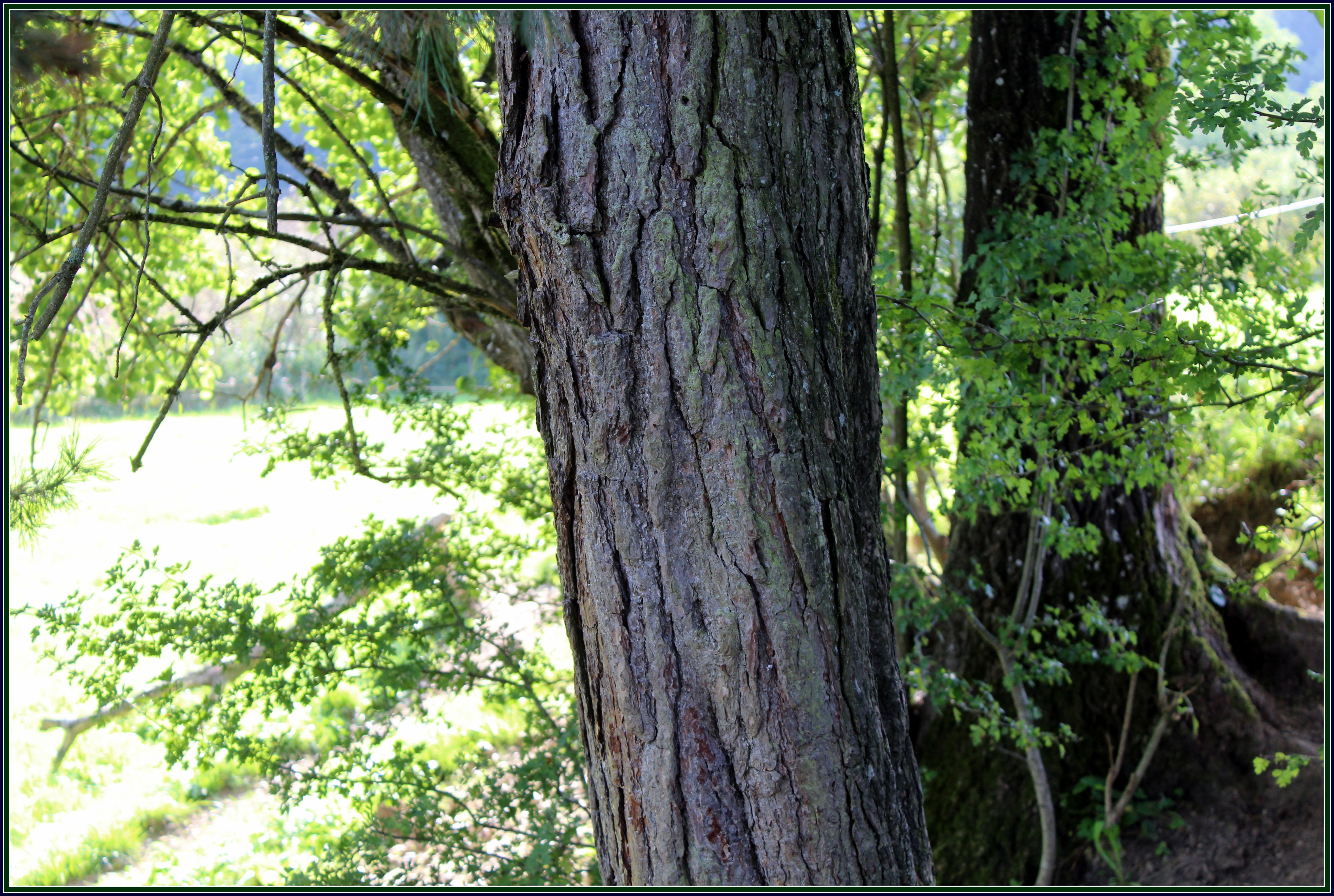 - Stamm der Föhre. Die Kiefer ist der älteste Baum der Gruppe. Sie ist bestimmt schon hundert Jahre alt.
