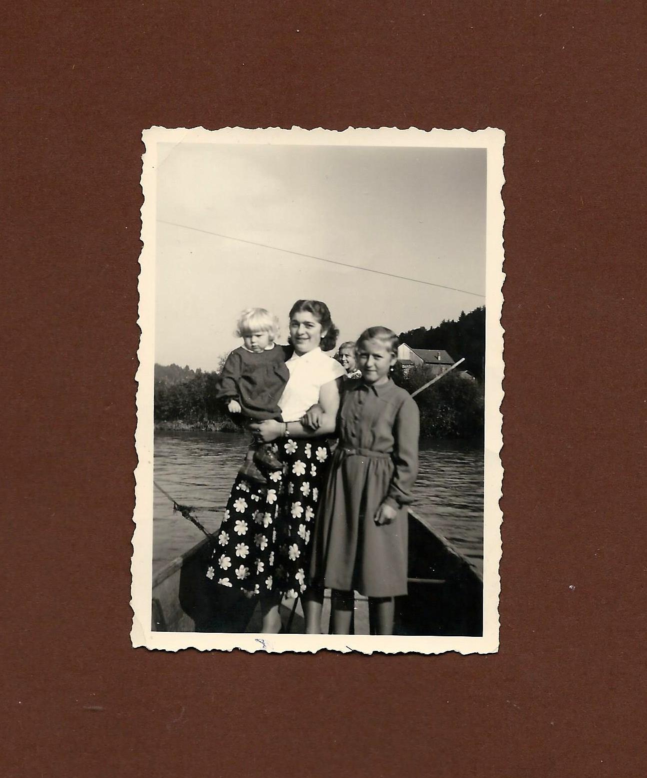 Acht Endres Kinder auf dem Landesteg. Der Steg erleichterte den Kähnen und den Flößen das Anlanden. Für die Kinder war das Stehen auf der Landebrücke eine kleine Mutprobe.
