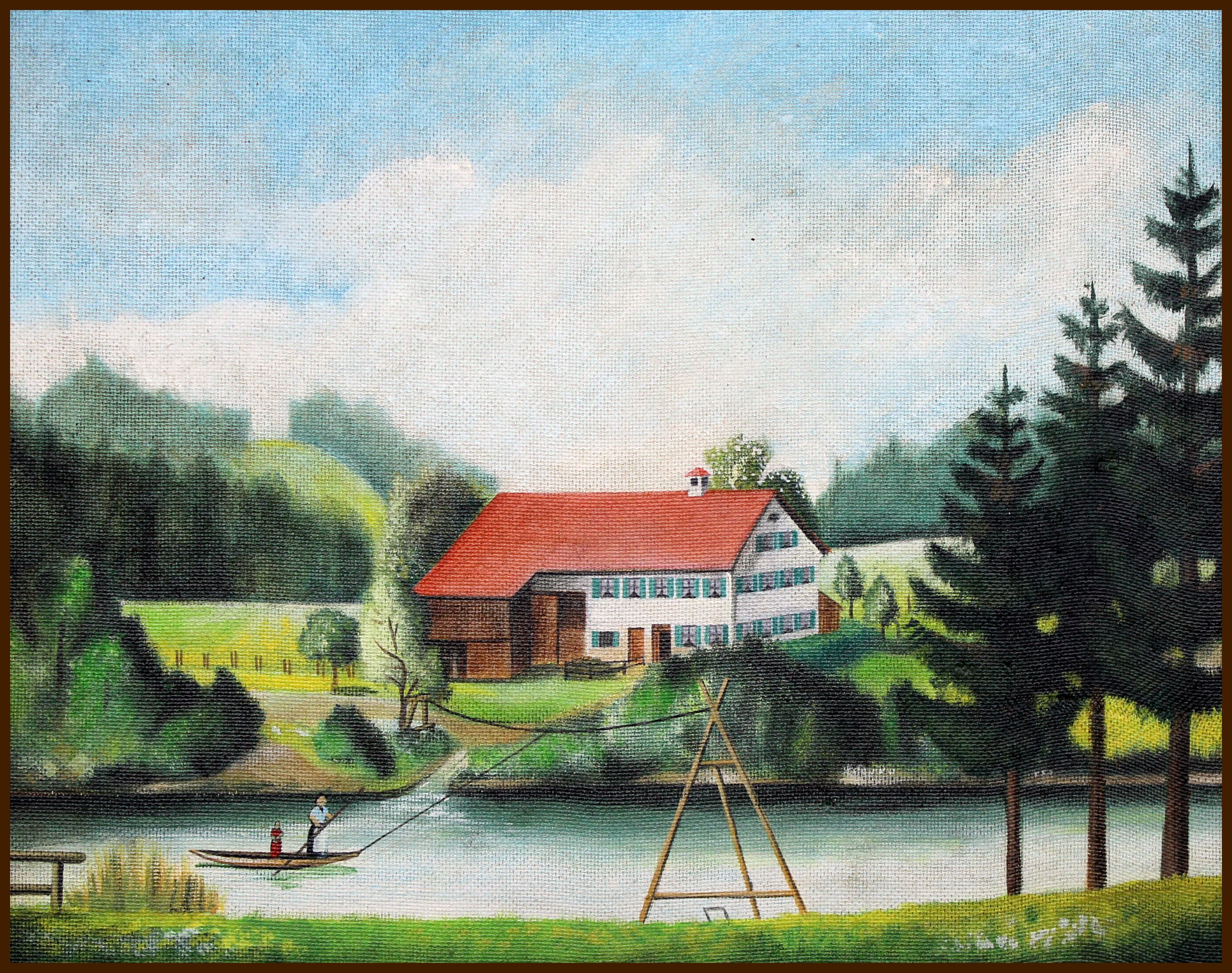 In schöner erhabener Lage stand der Hof über der Iller. Gebhard Eyerschmalz hat für B. Schmalholz den Hof in Ried gemalt. Man sieht deutlich das Seil, das die Iller überspannt.
