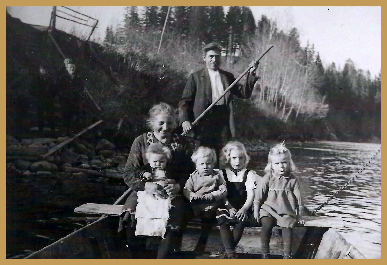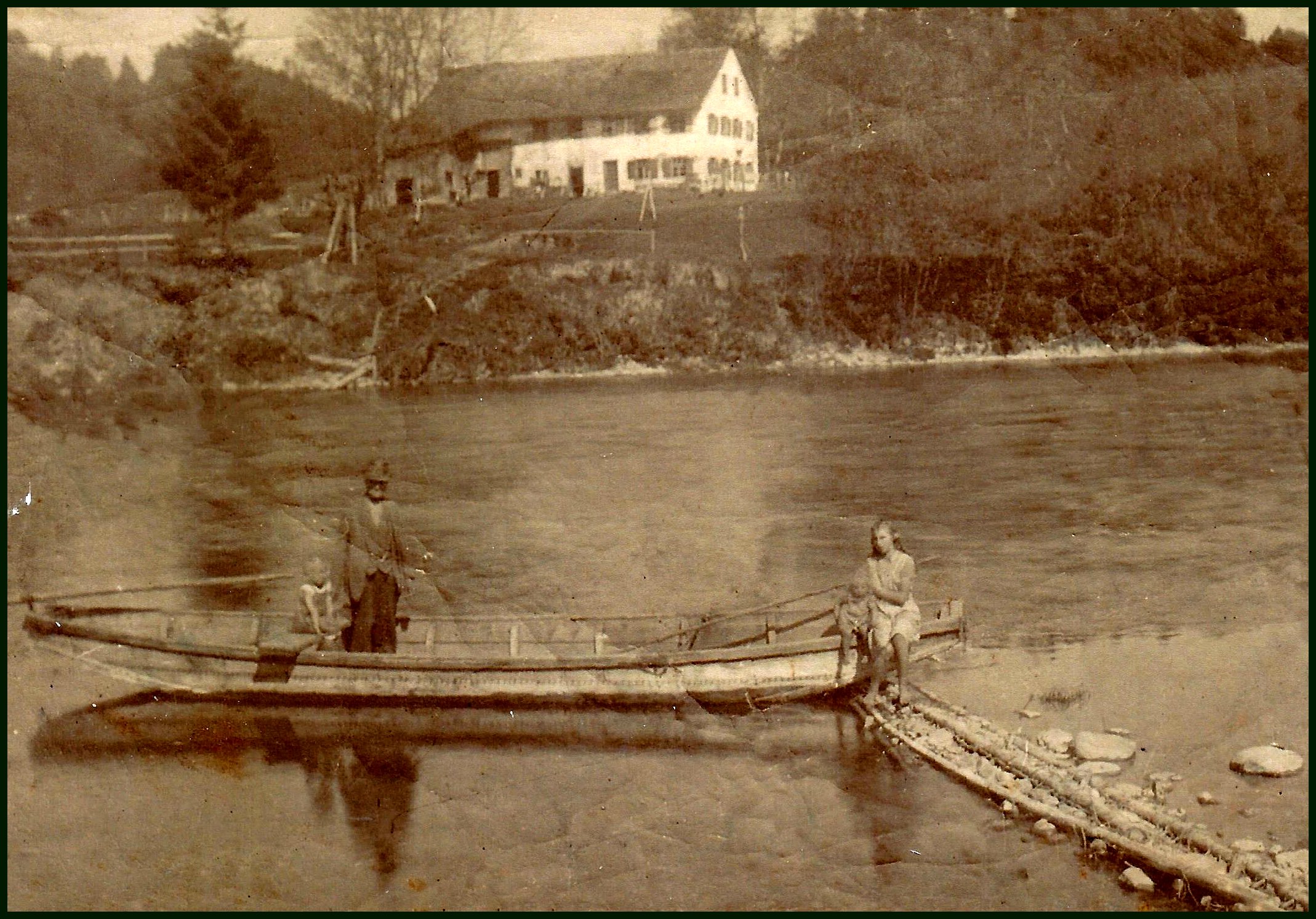 Auf der Reicholzrieder Seite in Ried. Fährmann Georg Endres mit seiner Frau Franziska und den Kindern Balbina, Hans, Verona und Rosa. Drei Buben schauen vom Ufer aus zu. Beiderseits der Iller war eine Ziehglocke angebracht. Bei Tag und bei Nacht konnte übergesetzt werden. Die Überfahrt kostete nur zwanzig Pfennig.