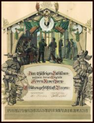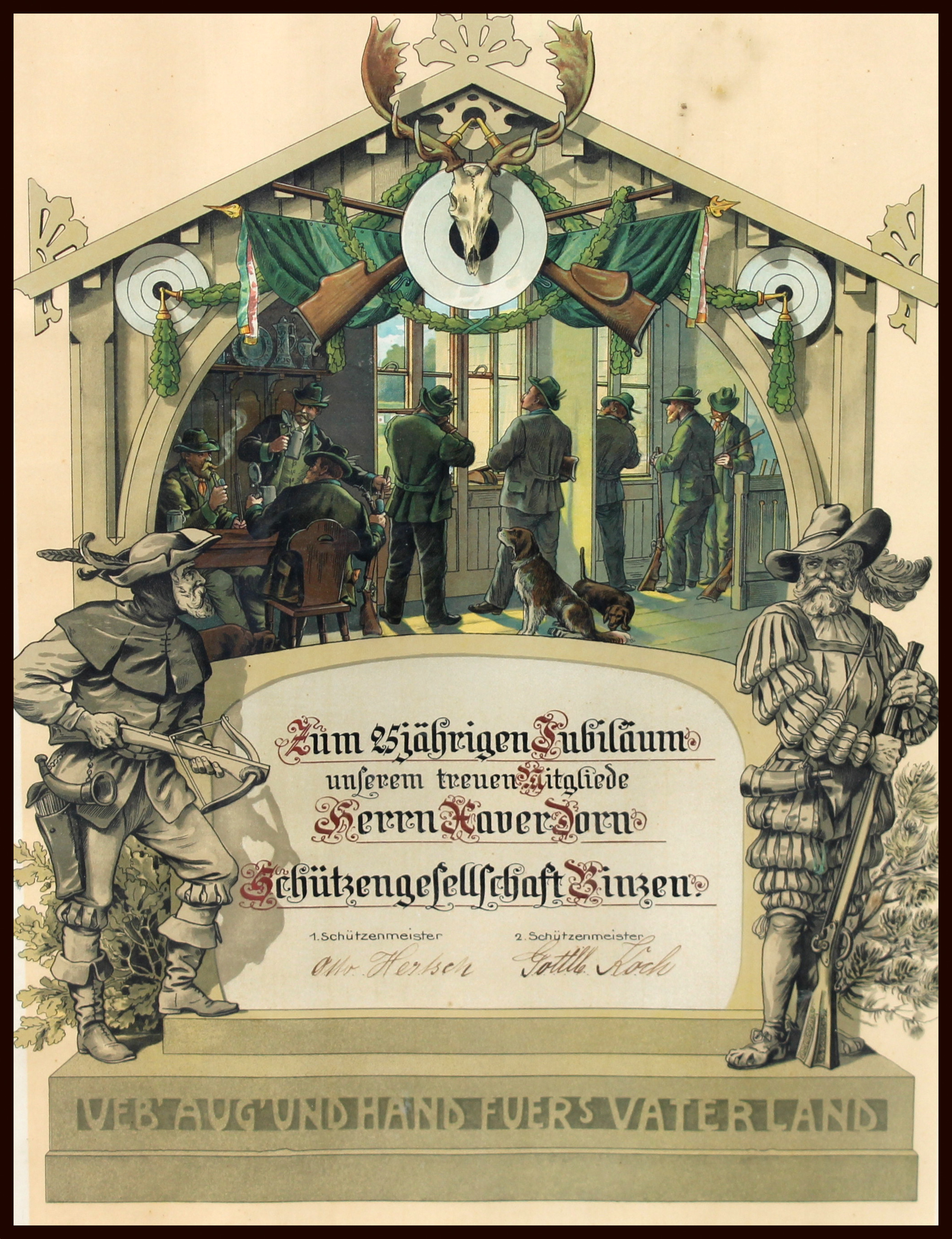 Zum 25 jährigen Jubiläum unserem treuen Mitgliede Herrn Xaver Dorn Schützengesellschaft Binzen 1. Schützenmeister Otto Hertsch und 2. Schützenmeister Gottlle Koch - VEB - Aug und Hand fürs Vaterland