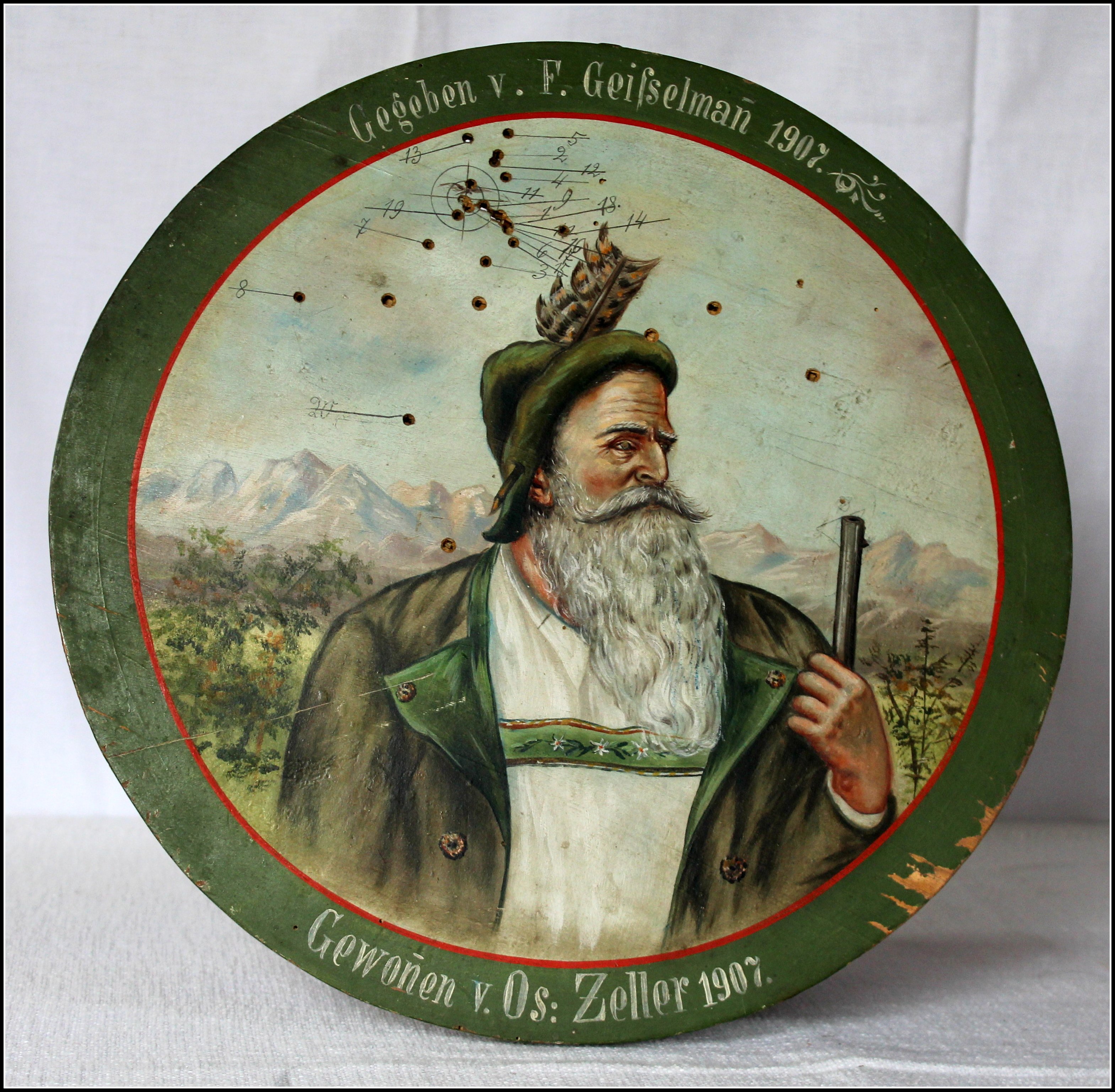 1913 Ferdinand Geißelmann malte und spendete zum Endschießen diese Schützenscheibe. Der Gewinner des 1. Preises war Fridolin Daiser. Gekonnt hat Geißelmann die preisgekrönte Kuh von vorne gemalt. Der Bauer mit dem Stecken trägt einen roten Wams und einen Hut mit Feder. Im Hintergrund das Panorama der Allgäüer Alpen. Grünten und Großer Daumen sind deutlich erkennbar.