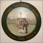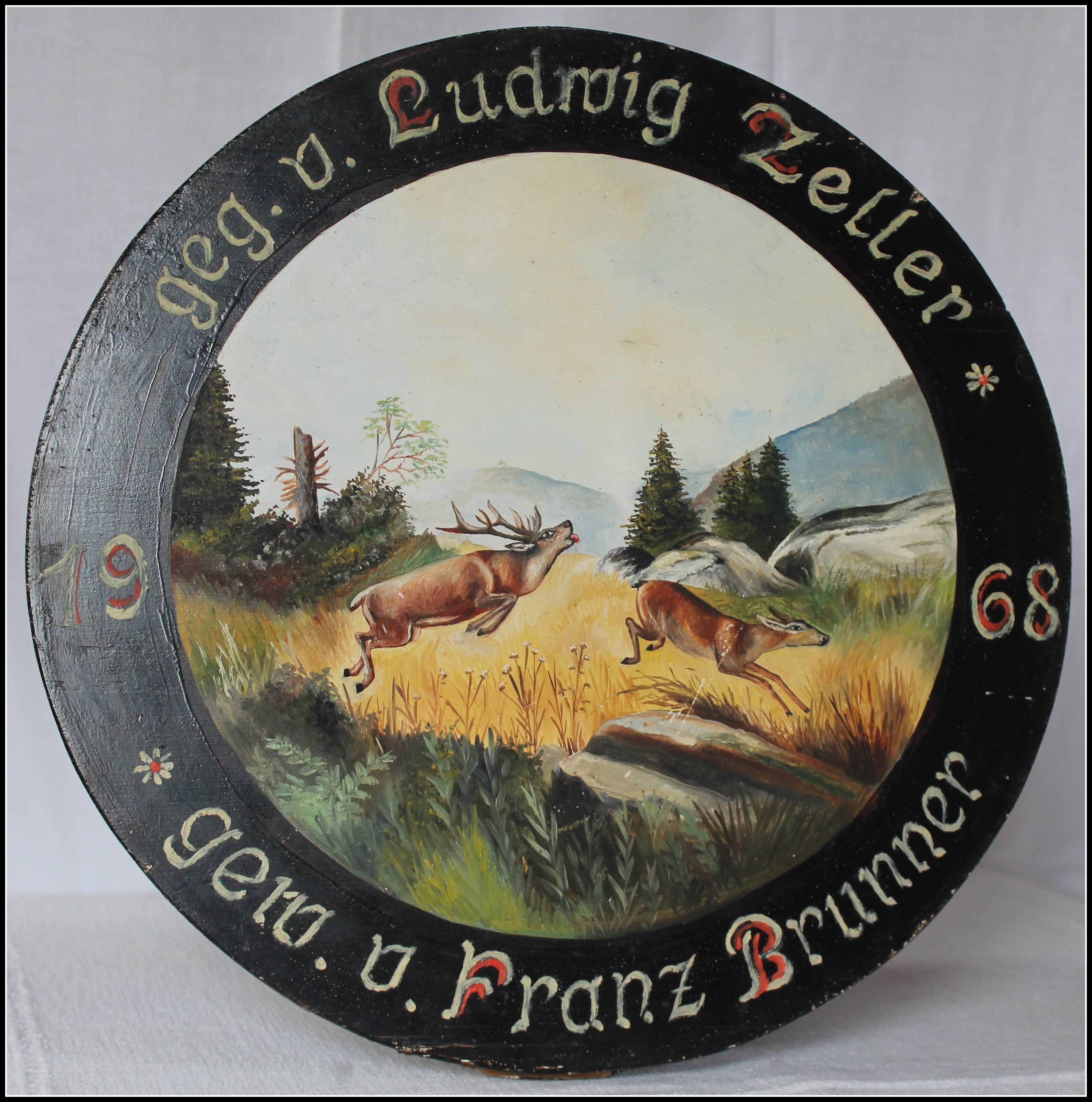 - 1925 Bei dieser Scheibe ist das Motiv nicht gemalt sondern aufgedruckt. Ein prächtiger Hirsch springt durch den herbstlichen Auwald. Strahlen mit dem Bleistift gezogen erleichtern das Auszählen der Punkte. Gestiftet wurde die Scheibe von Otto Kress und gewonnen von Franz Kress.