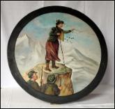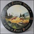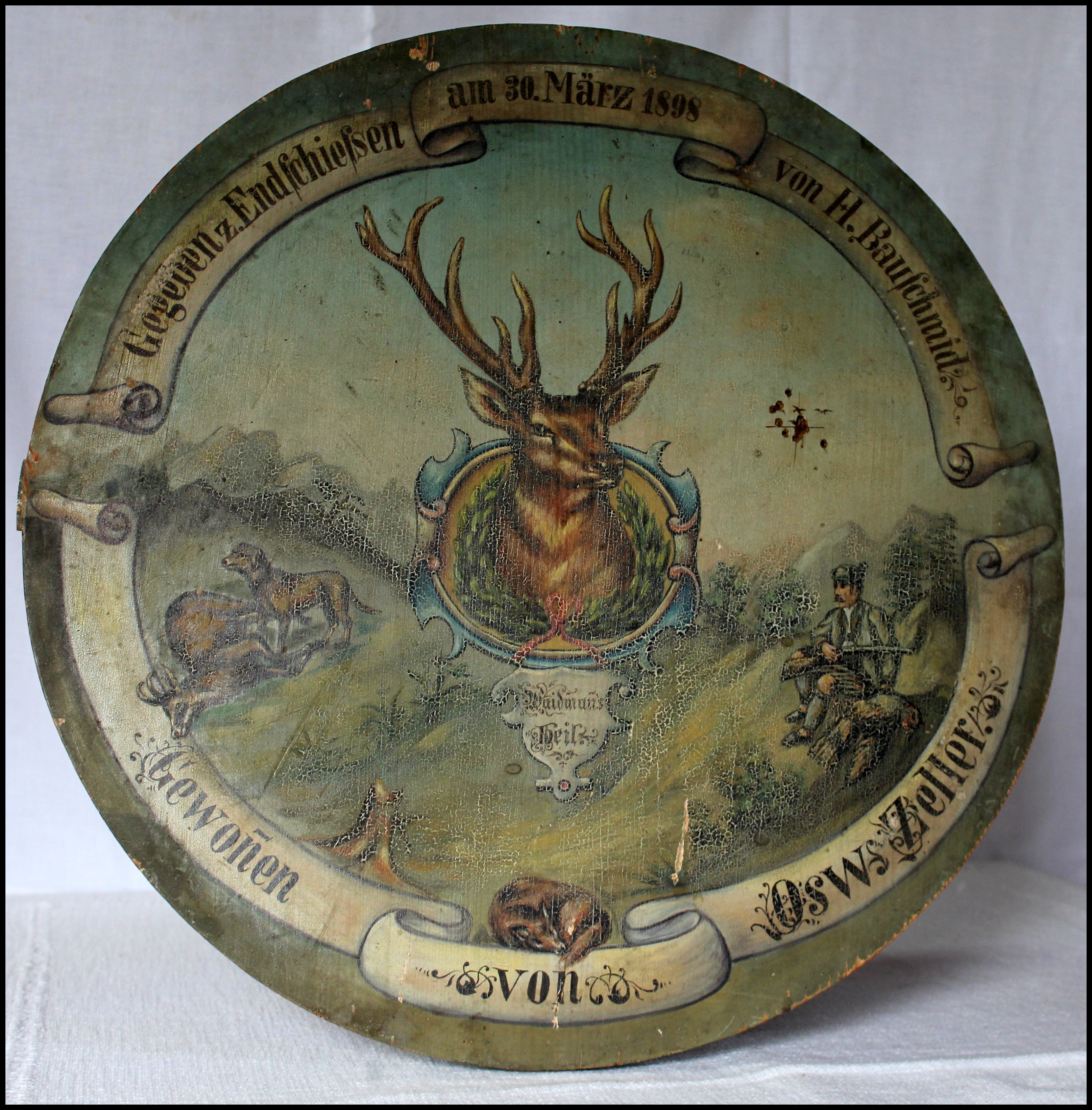 1898 Gestiftet von H. Bauschmid und gewonnen von Oswald Zeller. Szenen aus der Jägerei. Jäger mit erlegtem Adler, schlafender Fuchs, Hirschkopf mit Geweih, Hund und Gams.