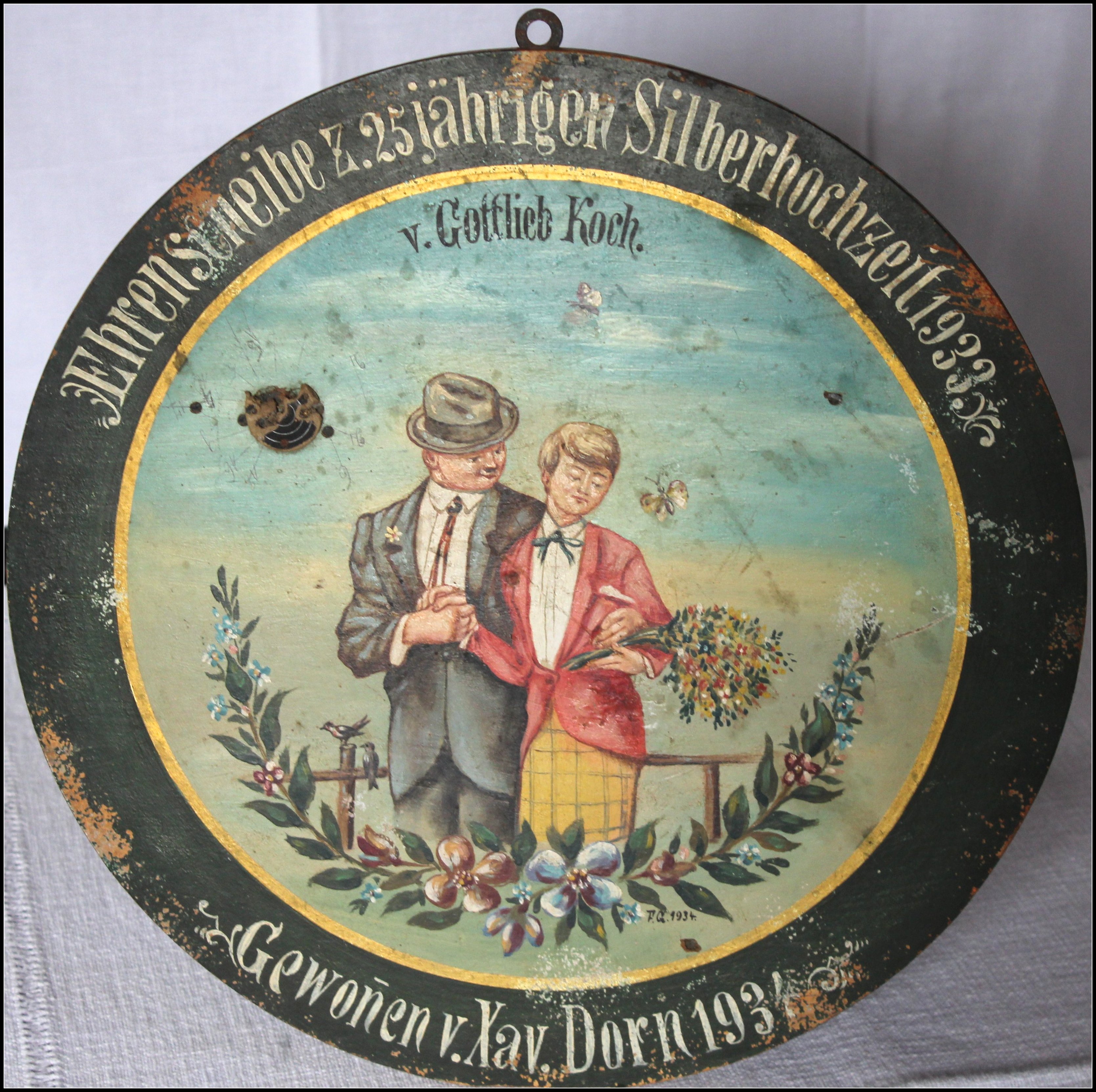 1934 Ehrenscheibe zur fünfundzwanzigjährigen Silberhochzeit, die Frau in der Mode der Zeit . Blumenstrauß und Girlanden schmücken die Szene.