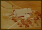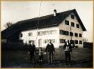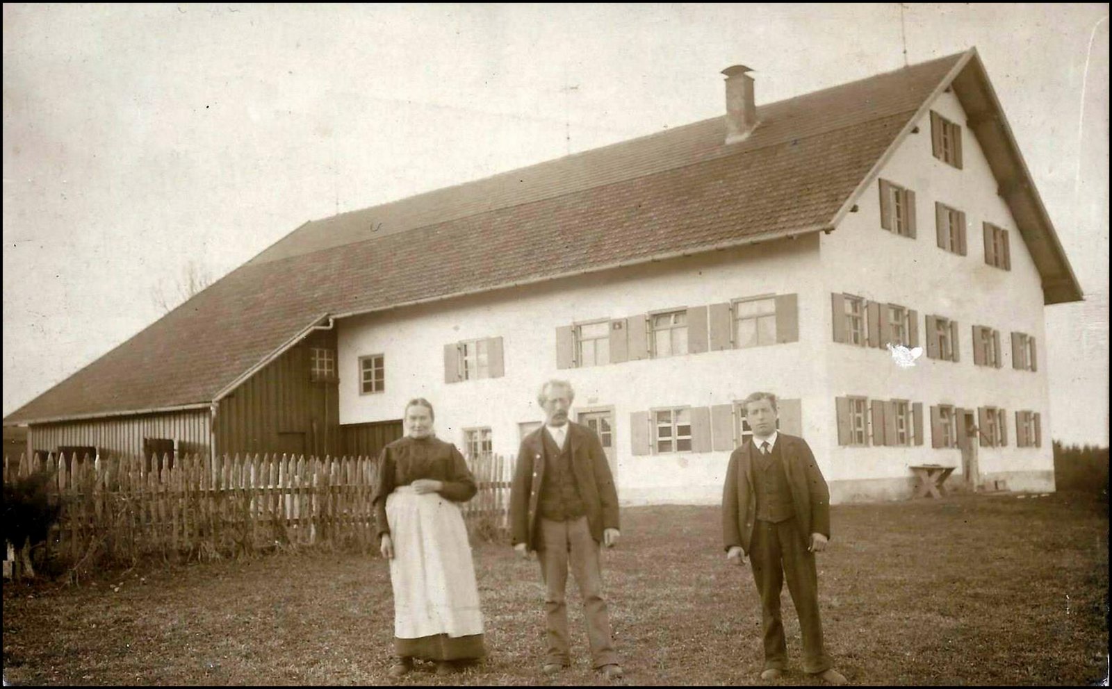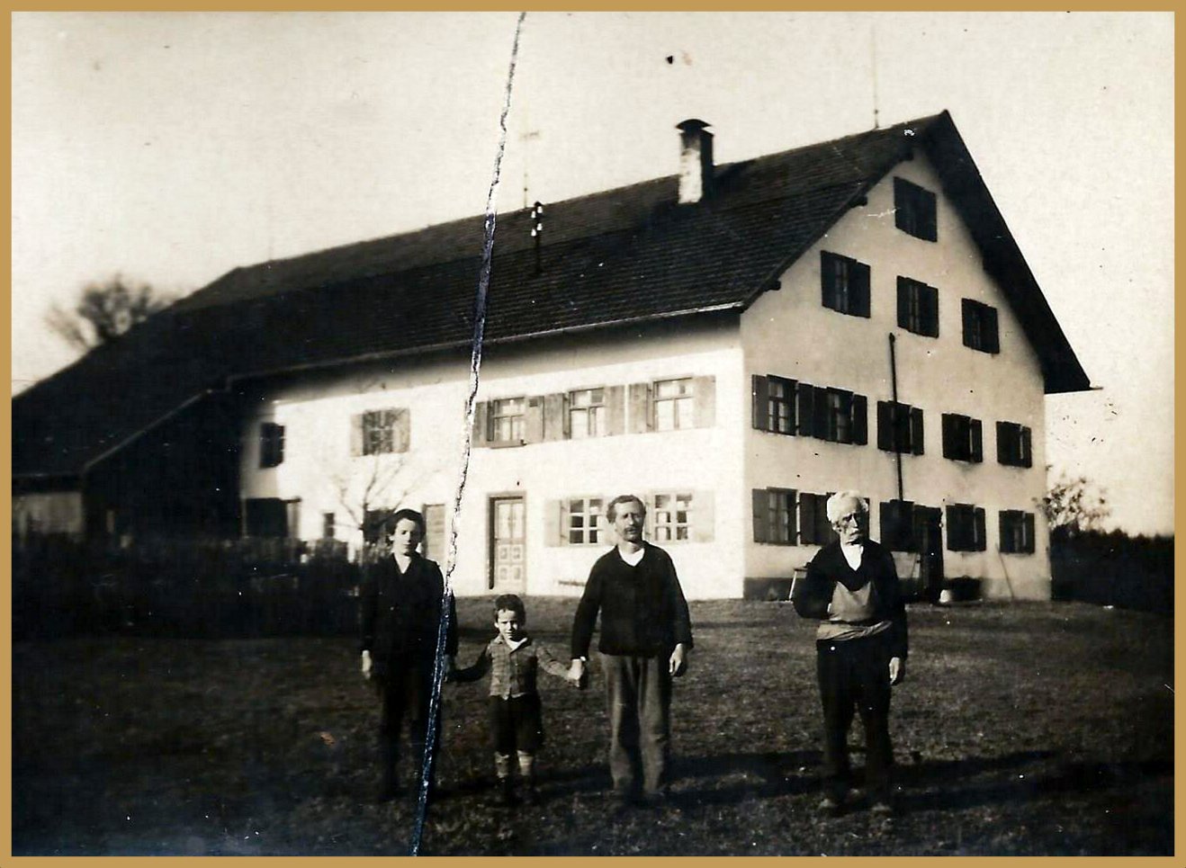 Bild 1. Drei Generationen Albrecht. Die Wasserpumpe auf der Giebelseite ist nun modernisiert. Sie wird von einem Motor angetrieben. Am Hauseingang der Brunnen.