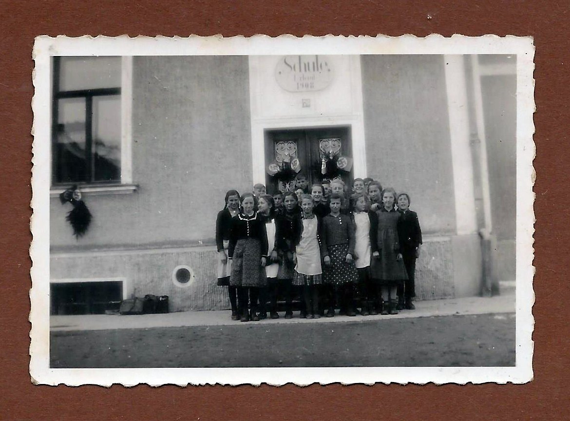 - Klassenfoto vor dem Schuleingang, in der Mitte Maria
