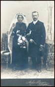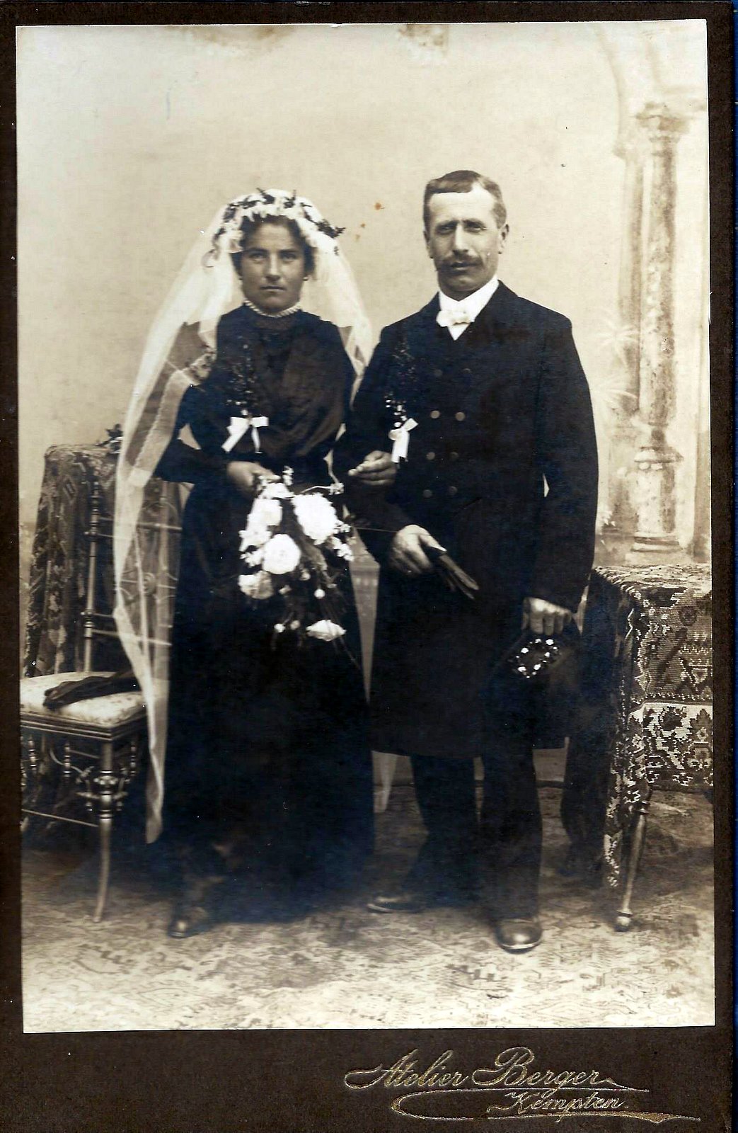 Franz-Joseph Albrecht heiratet 1911 Theresia Uhl. Zur Hochzeit trug die Braut ein langes schwarzes Kleid mit einem weißen Schleier. Das Foto entstand im Fotoatelier Berger in Kempten.