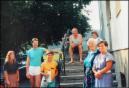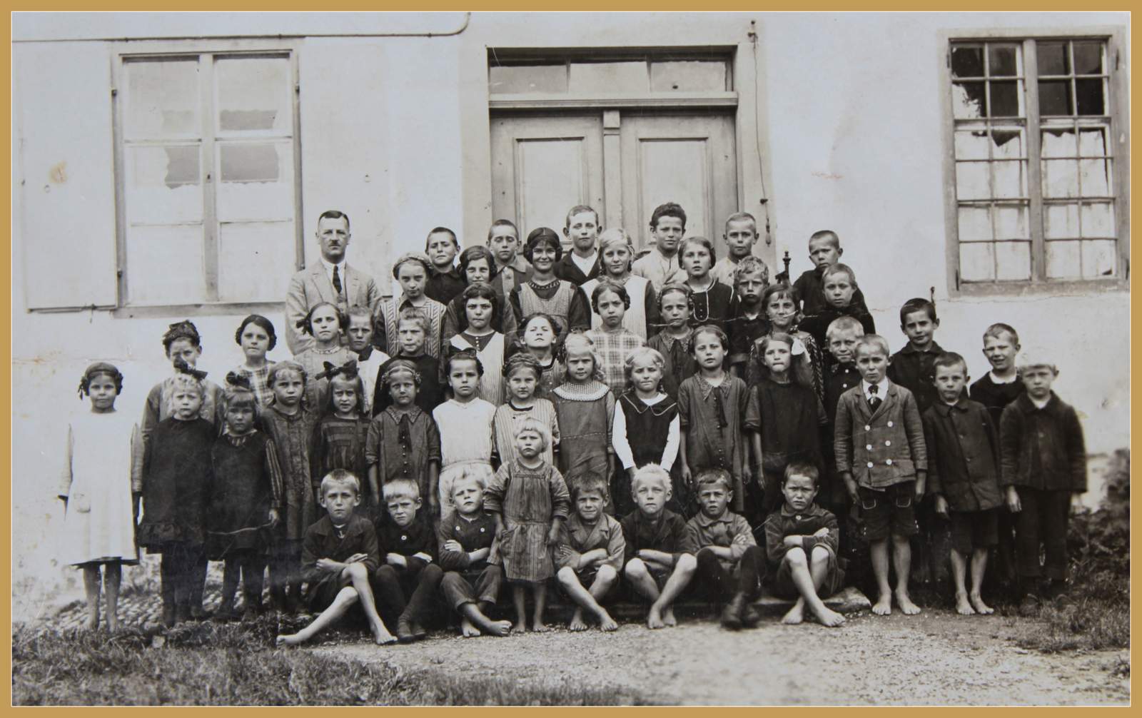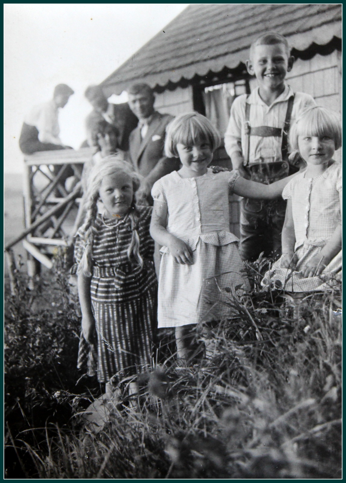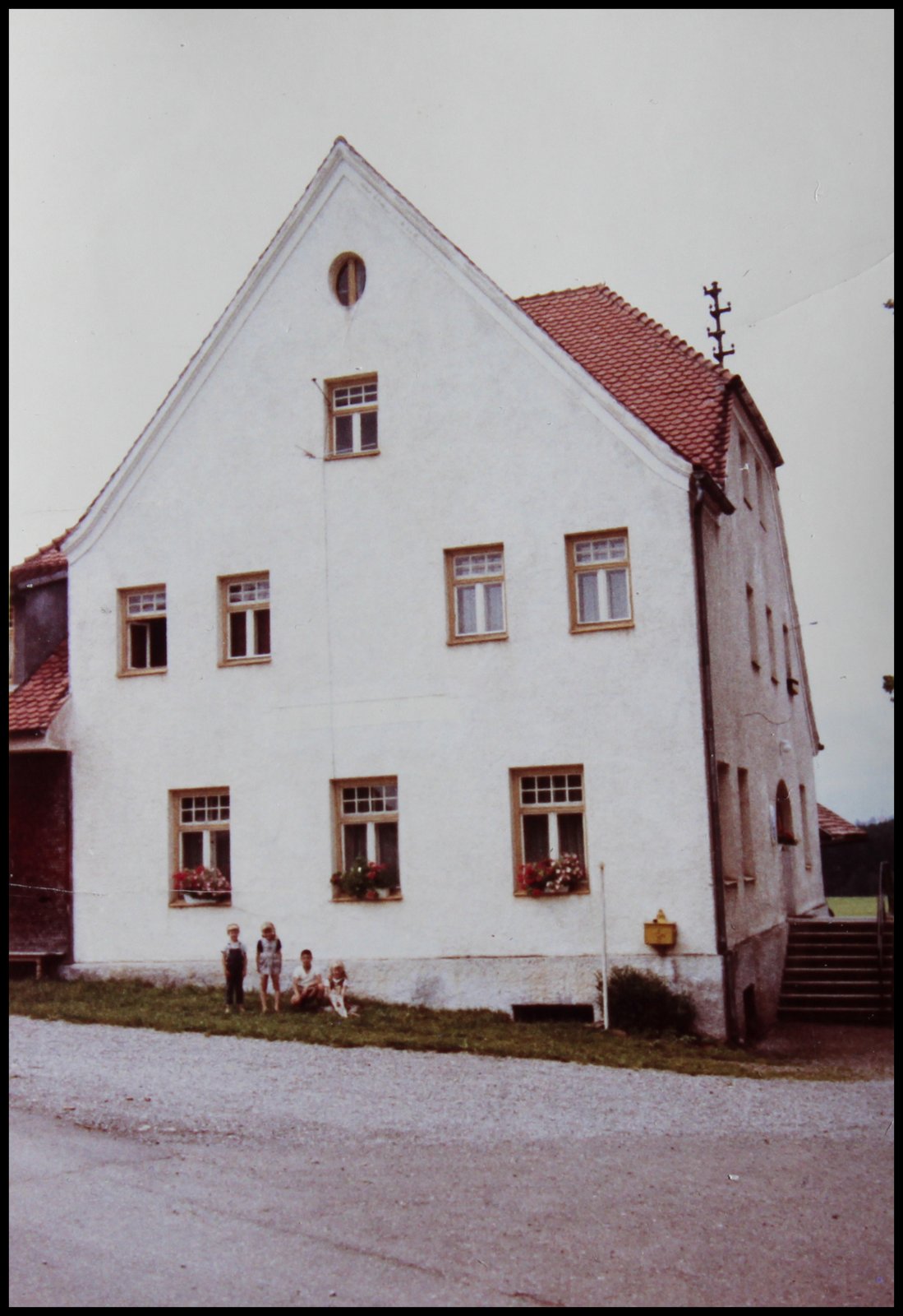 Bei der Haustreppe am Gasthaus zur Linde. Zwanzig Jahre später, Feriengäste sind da.