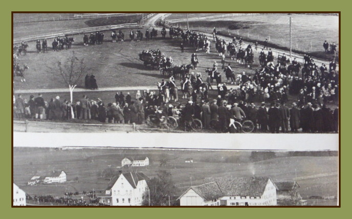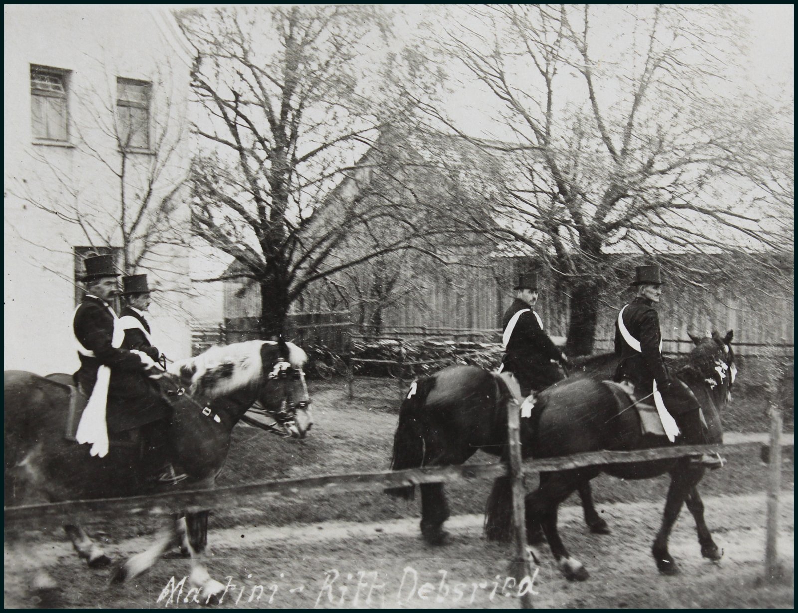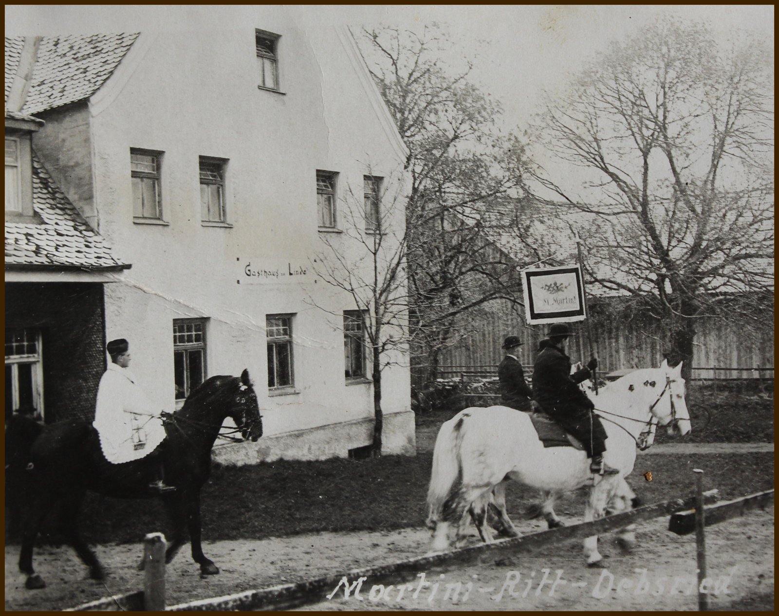 Martiniritt. Der Pfarrer auf einem Rappen, die Reiter auf Schimmel. Auf einer Wiese hinter dem Gasthaus zur Linde fand die Segnung der Pferde statt.