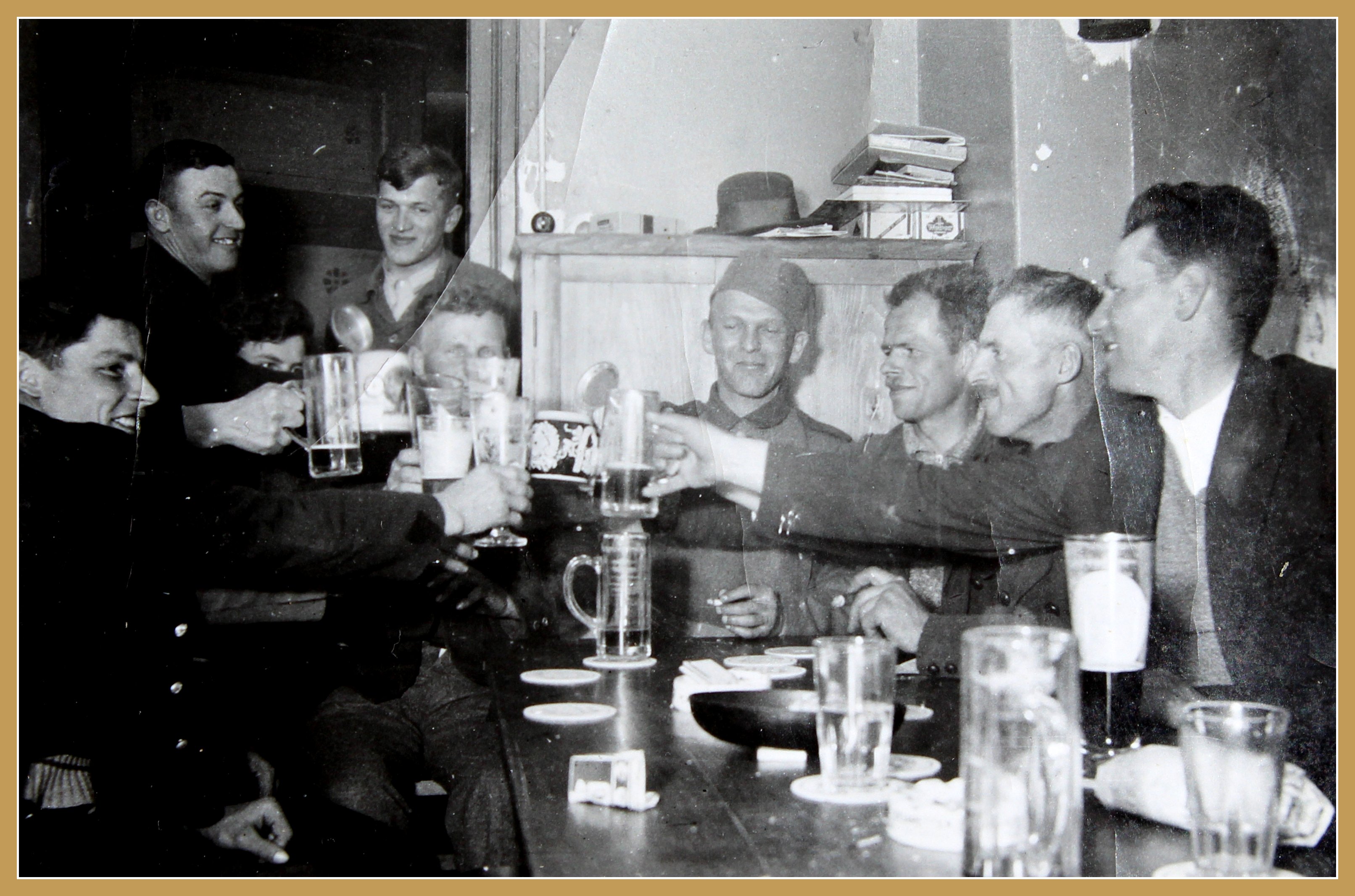 An der Theke: Neun Gäste stoßen miteinander an.