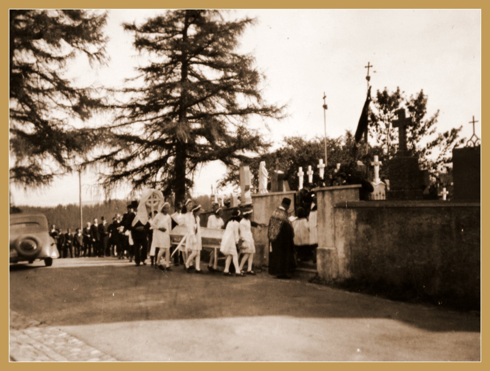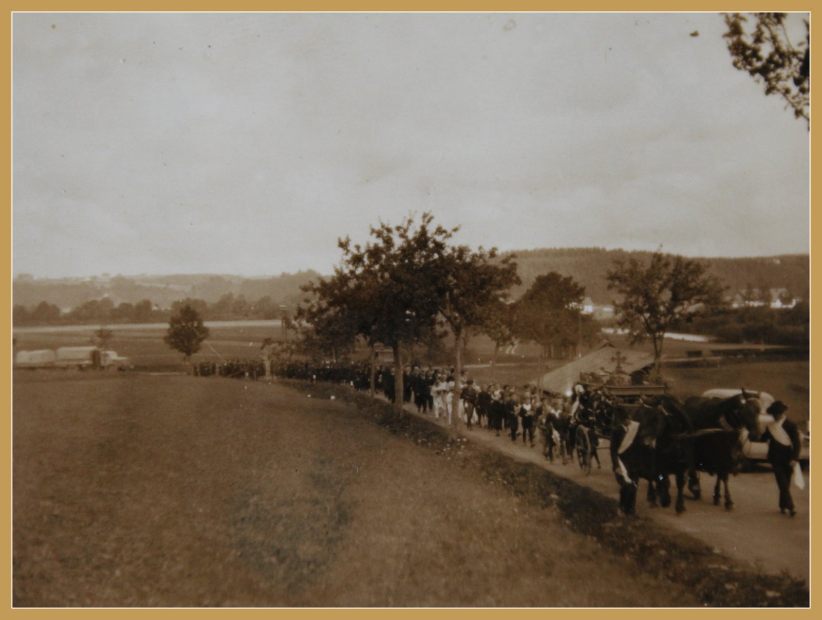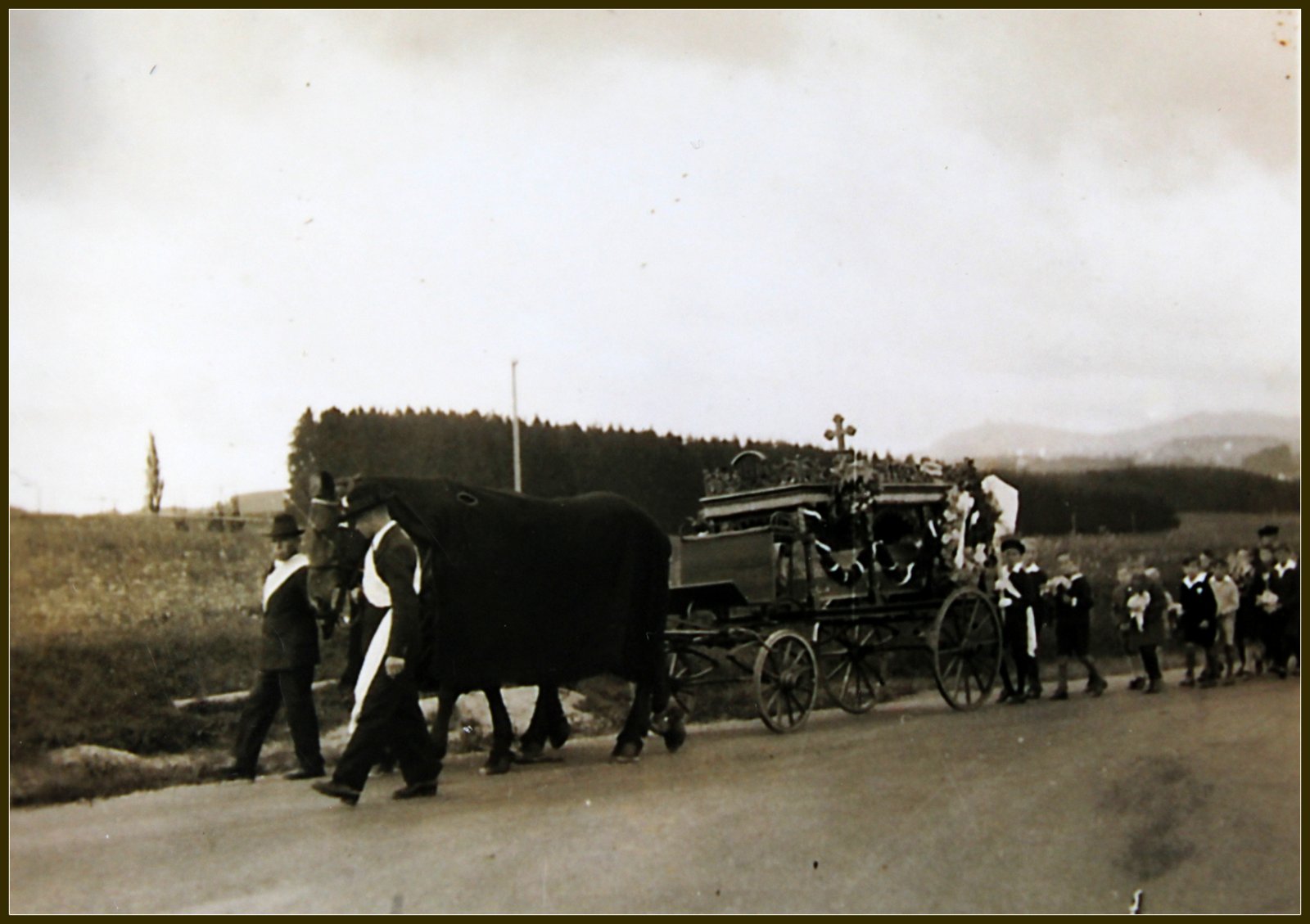 Es war ein weiter Weg von Depsried bis zum Friedhof. Fast das ganze Dorf nahm daran teil. Vorne der Leichenwagen, von zwei Rappen gezogen. Zwei Männer mit Schärpen führen die Pferde.