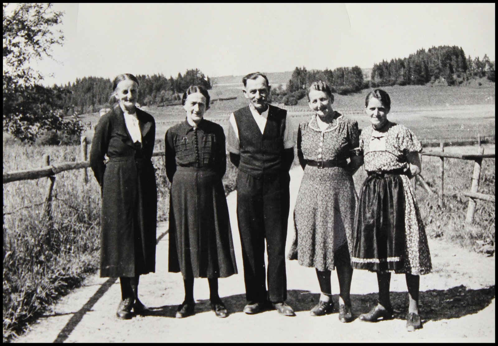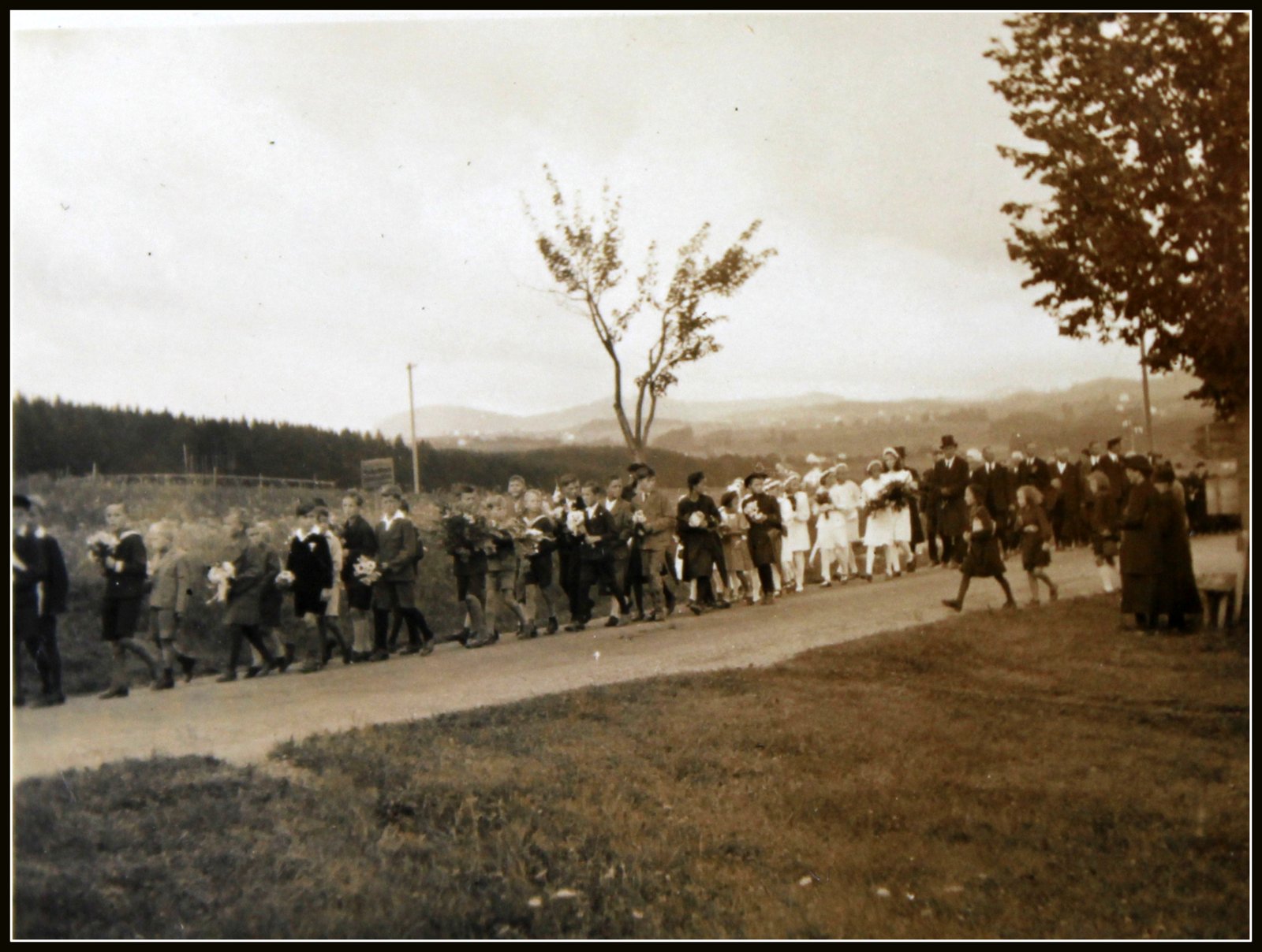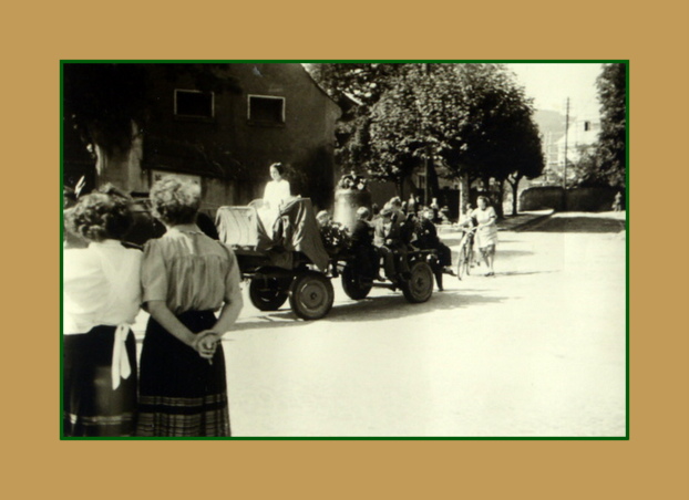 Es war ein weiter Weg von Depsried bis zum Friedhof. Fast das ganze Dorf nahm daran teil. Vorne der Leichenwagen, von zwei Rappen gezogen. Zwei Männer mit Schärpen führen die Pferde.