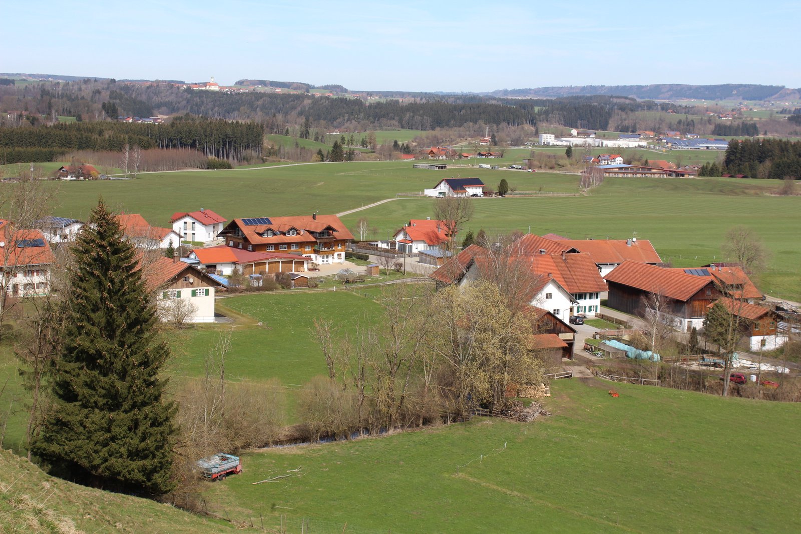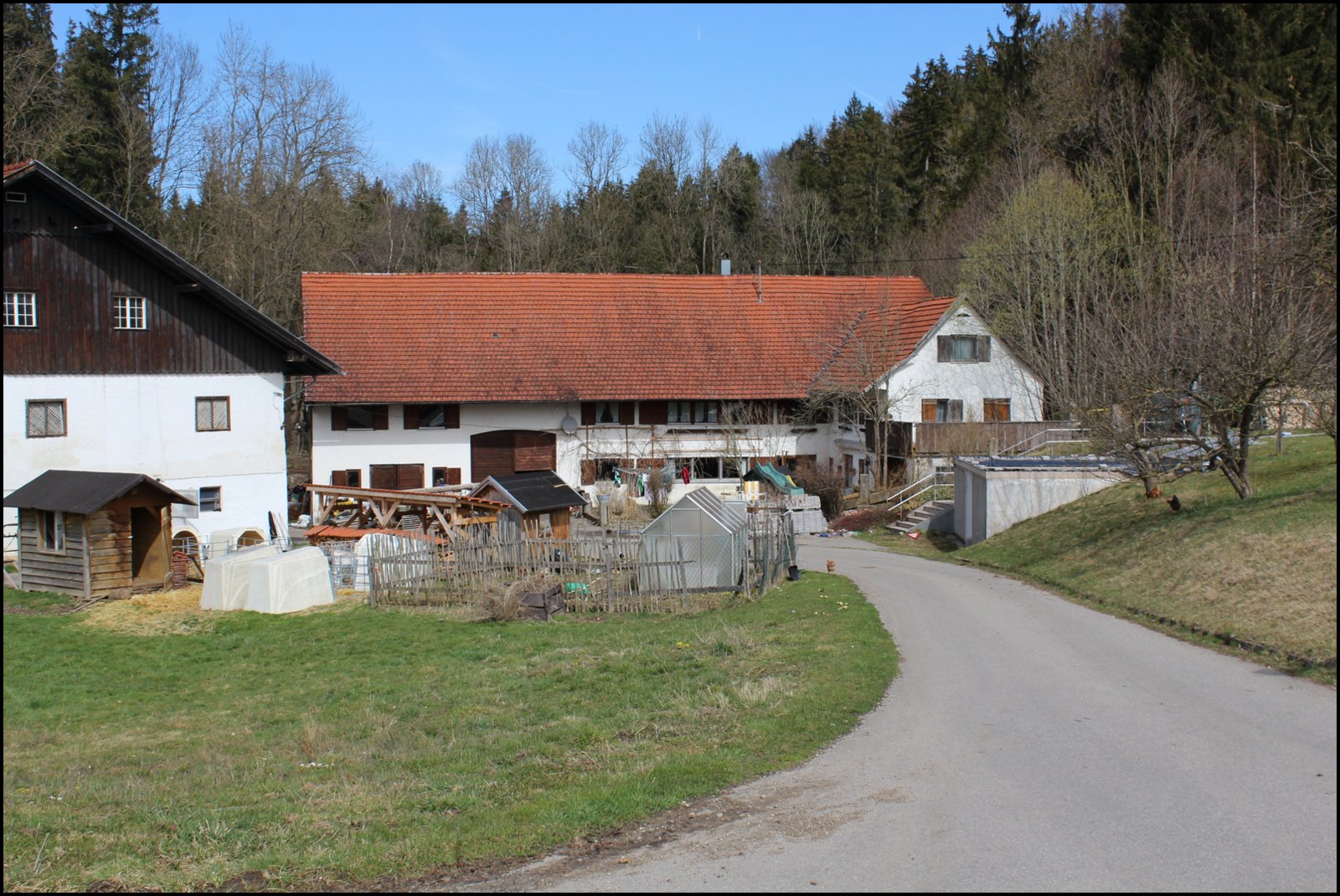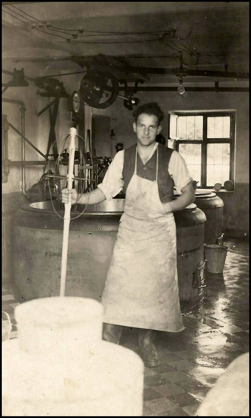 Nach Schweizer Vorbild hatte Hirnbein auch im Allgäu die Emmentalerherstellung eingeführt. So schlossen sich viele Landwirte zu Genossenschaften zusammen und bauten Käsküchen. Die kleinen Sennereien bestanden aber meist nur kurze Zeit. Später wurden sie zu Wohnhäusern umgebaut.Foto von Wucher. Auch Hofmeister, heute Champignon Heising, war ein Pionier der Käseherstellung. In seiner Jugend arbeitete Hofmeister in der Käseküche Isel. Im Vordergrund der Scheibenbach.