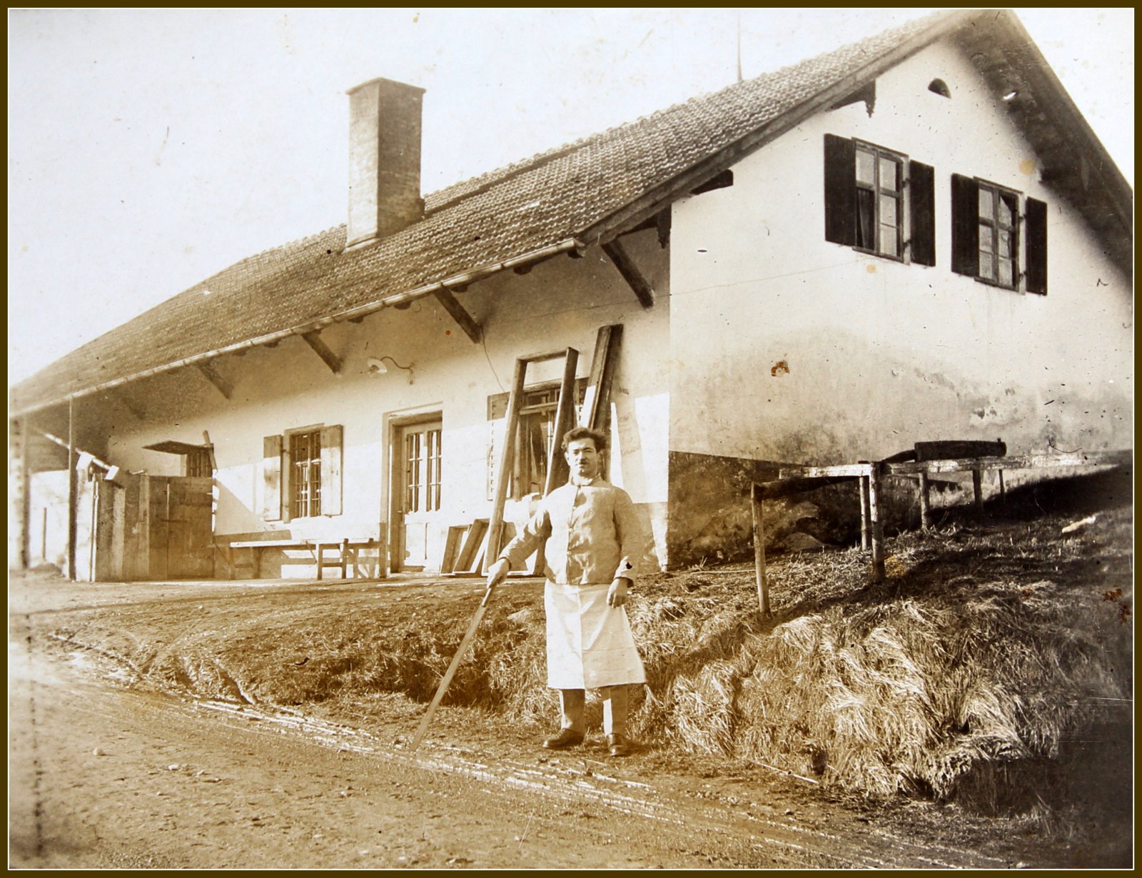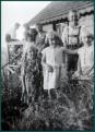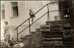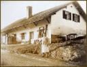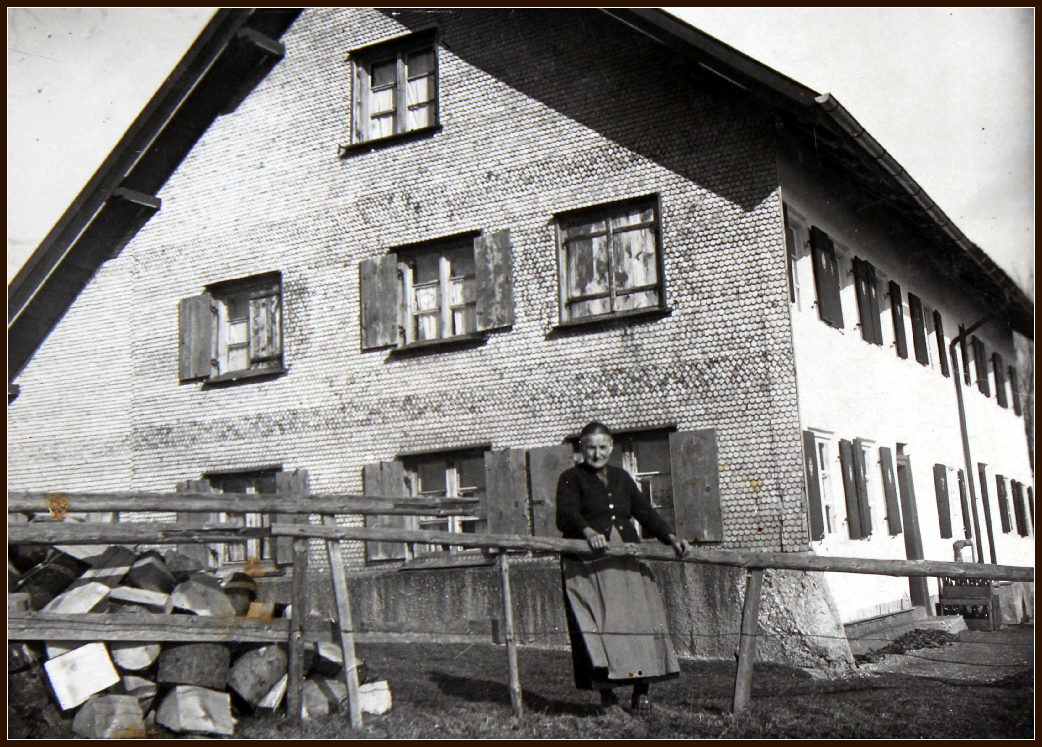 Der Vockenhof war ein langgezogener schmaler Hof. In der Breite fanden nur drei Fenster Platz. Die Westseite war verschindelt, Tante Lina steht davor. Der Vocken war eine sogenannte Hockwirtschaft, das heißt, man blieb meist nur für einen kleinen Trunk hocken. Doch sagte man auch: " Im Vocken ist gut hocken." Am Hauseingang stehen die leeren Bierkästen.