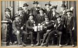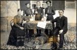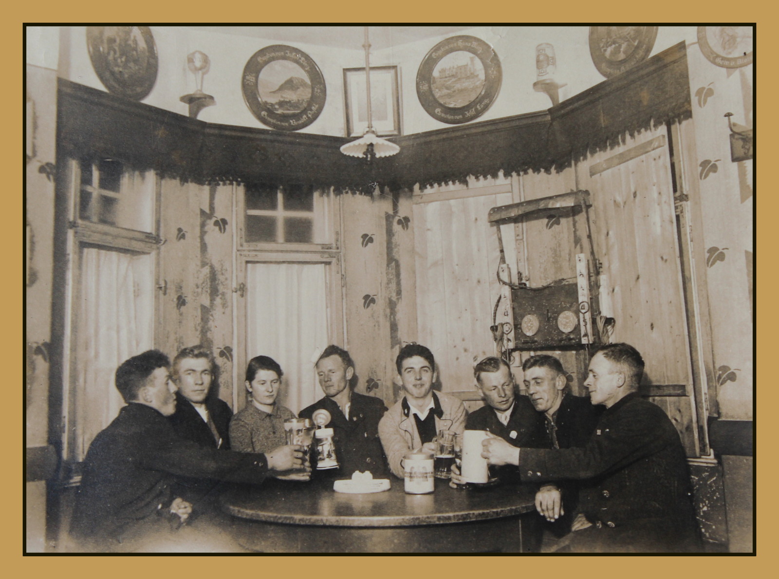 Im Gasthaus zur Linde sitzen an  dem runden Tisch im Erker acht Personen. Über dem Fries Schützenscheiben.