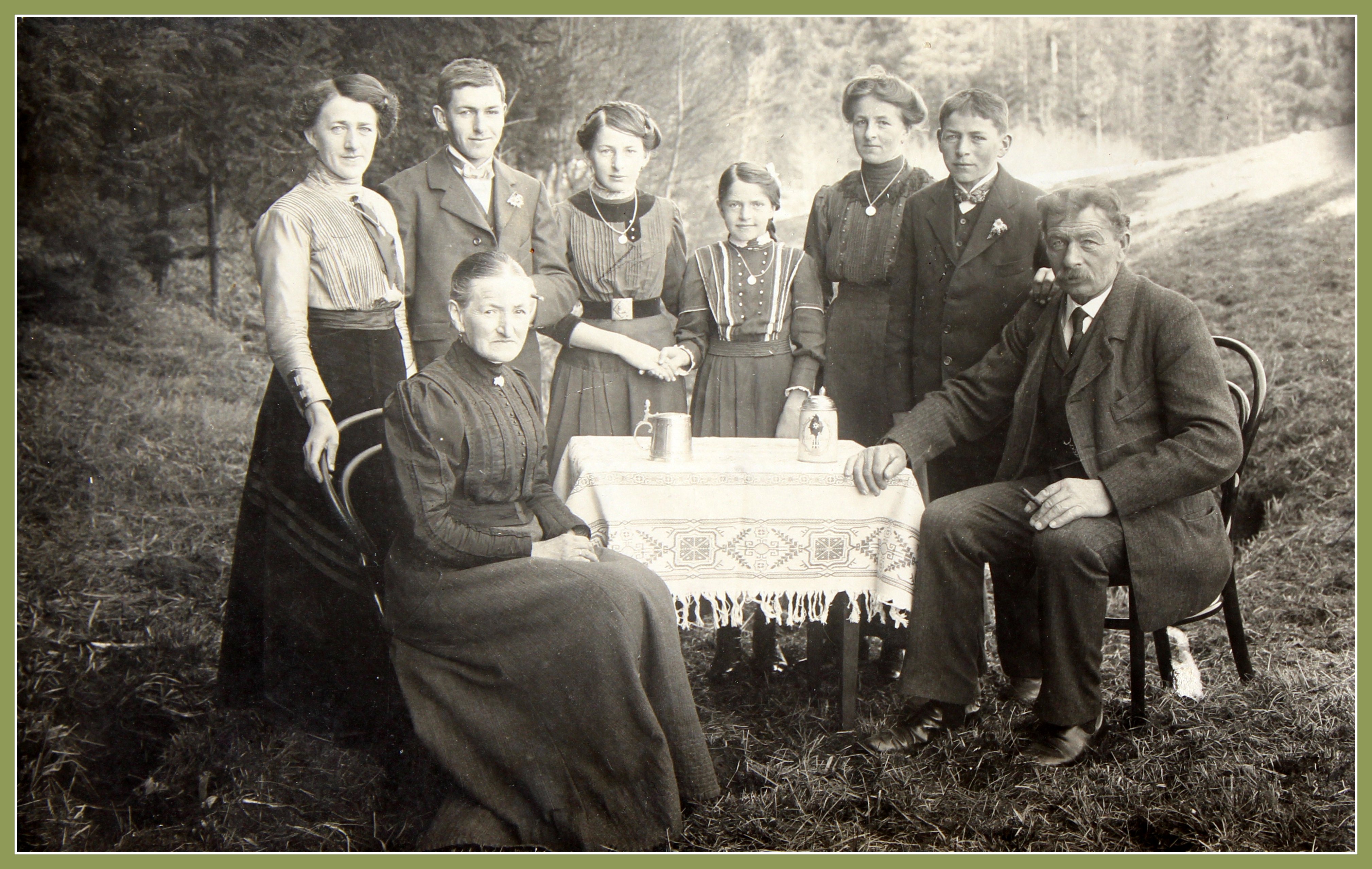Familie Bonaventura und Rosa Meggenrieder - Familie Briechle Schwarzenbach. Auf einerDecke ruht der Hund. Sohn mit Buch. Vater mit Bierkrug und Zigarre.