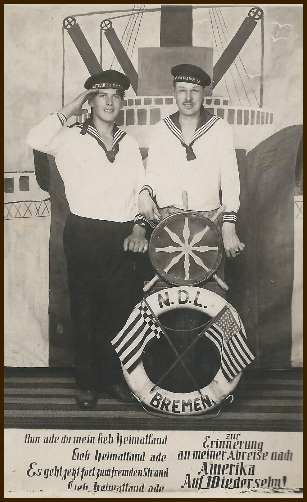 Text: "Nun ade du mein lieb Heimatland, lieb Heimat ade. Es geht jetzt fort zum fremden Strand, lieb Heimatland ade. "  Zur Erinnerung an meine Abreise nach Amerika. Auf Wiedersehn. 1930