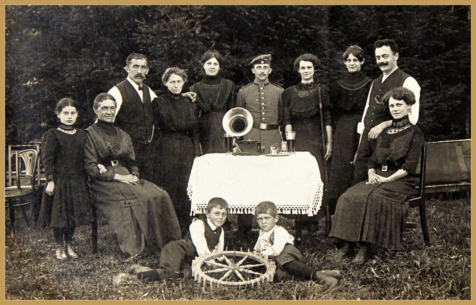 Prestel Burg. Auf dem Tisch ein Grammophon, die neueste technische Errungenschaft. Am Boden für die Kinder ein Spielzeugmühlenrad.