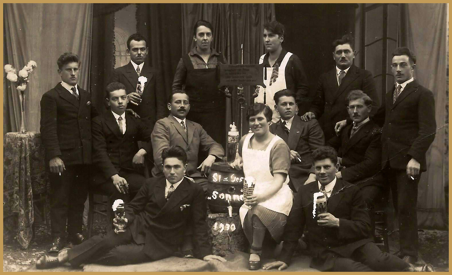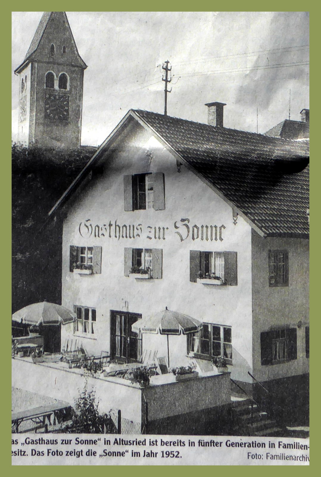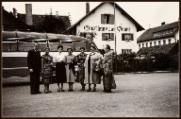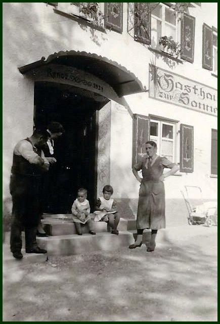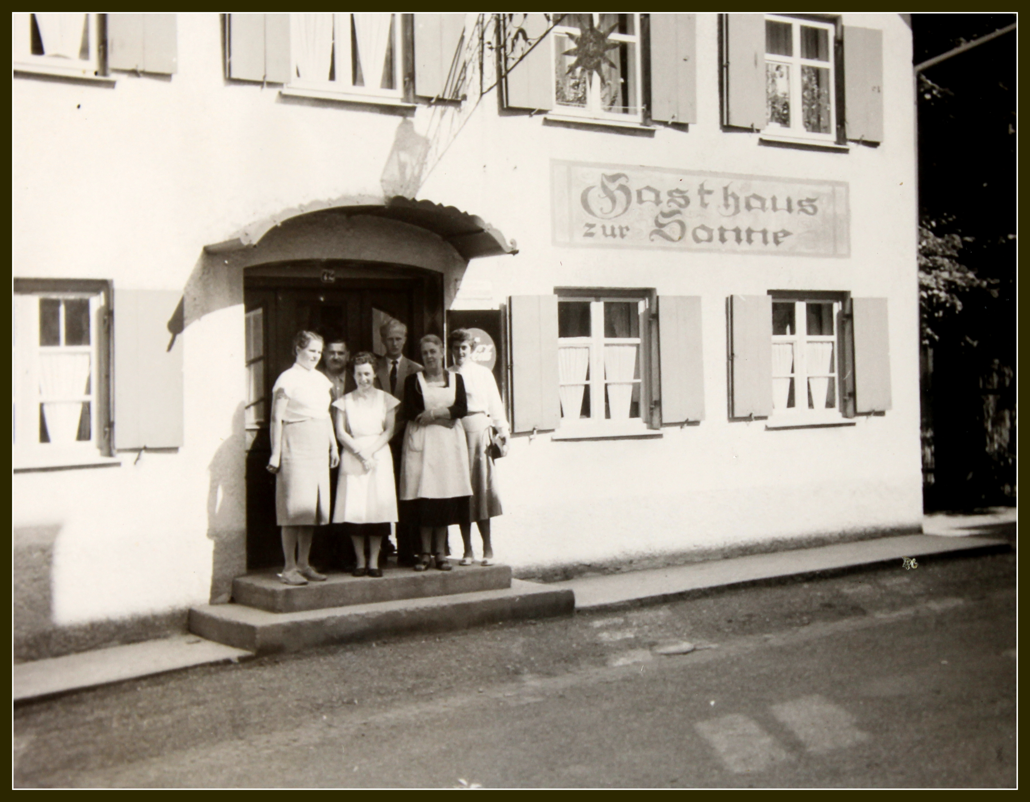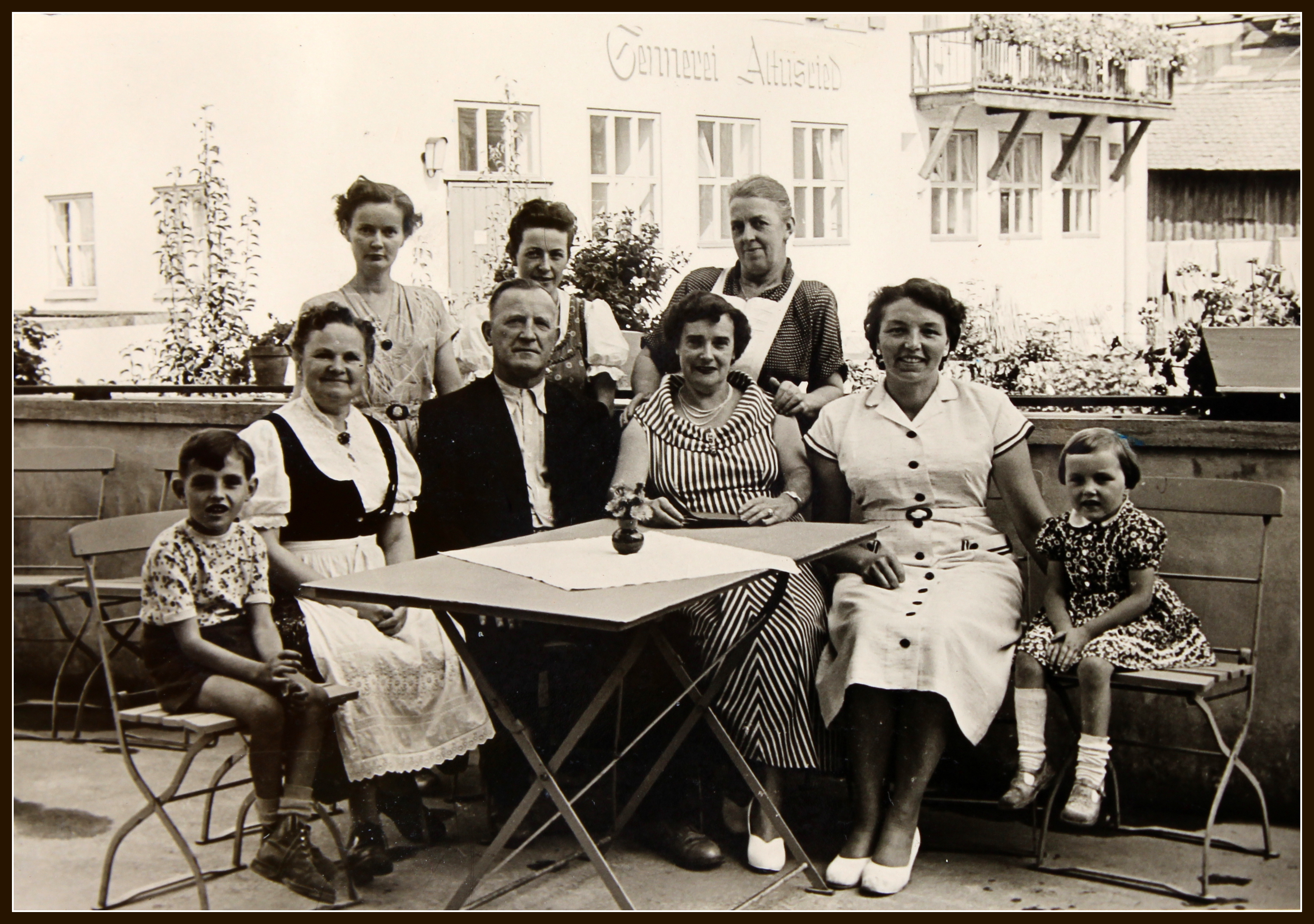 Fotos aus dem Gästebuch der Jahre 1955 und 1956 ,viele Saarländer kamen damals nach Altusried. Zu sehen sind auch die Gastgeber Hartmann ( Wirt und Schmiedemeister ) , seine Frau Justine Hartmann und die beiden Töchter Gusti und Elfriede. - Bild 3. Im Hintergrund die Sennerei, die später zum Rathaus umgebaut wurde. - Bild 4. Justine in der Mitte.