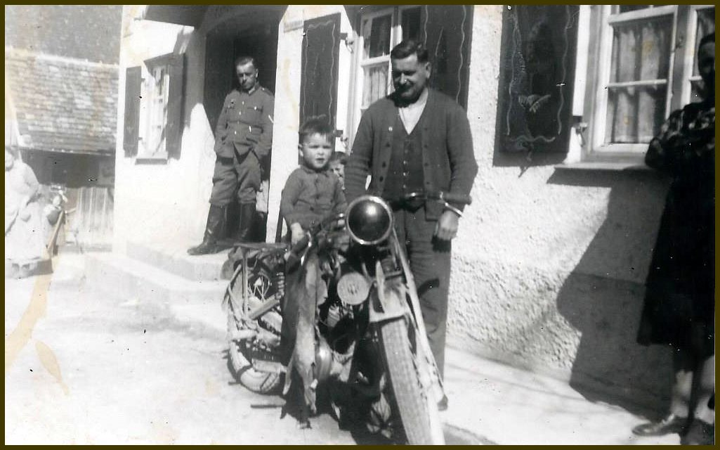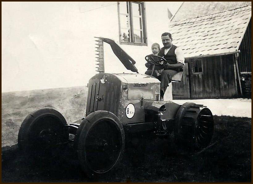 Der kleine Max auf dem Motorrad und die Tochter Elfriede auf dem Bulldog.