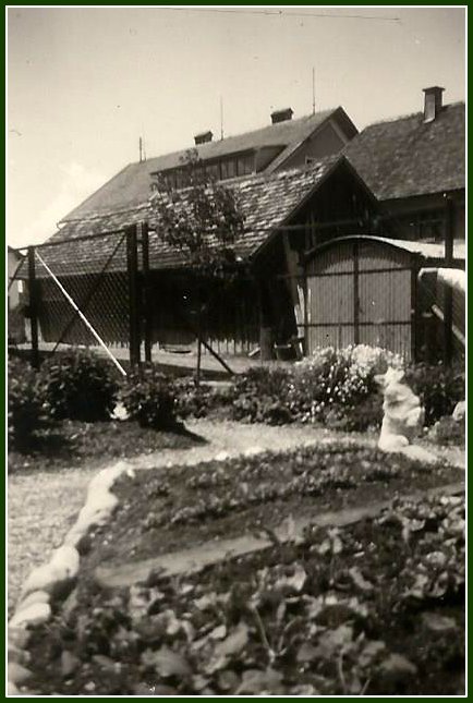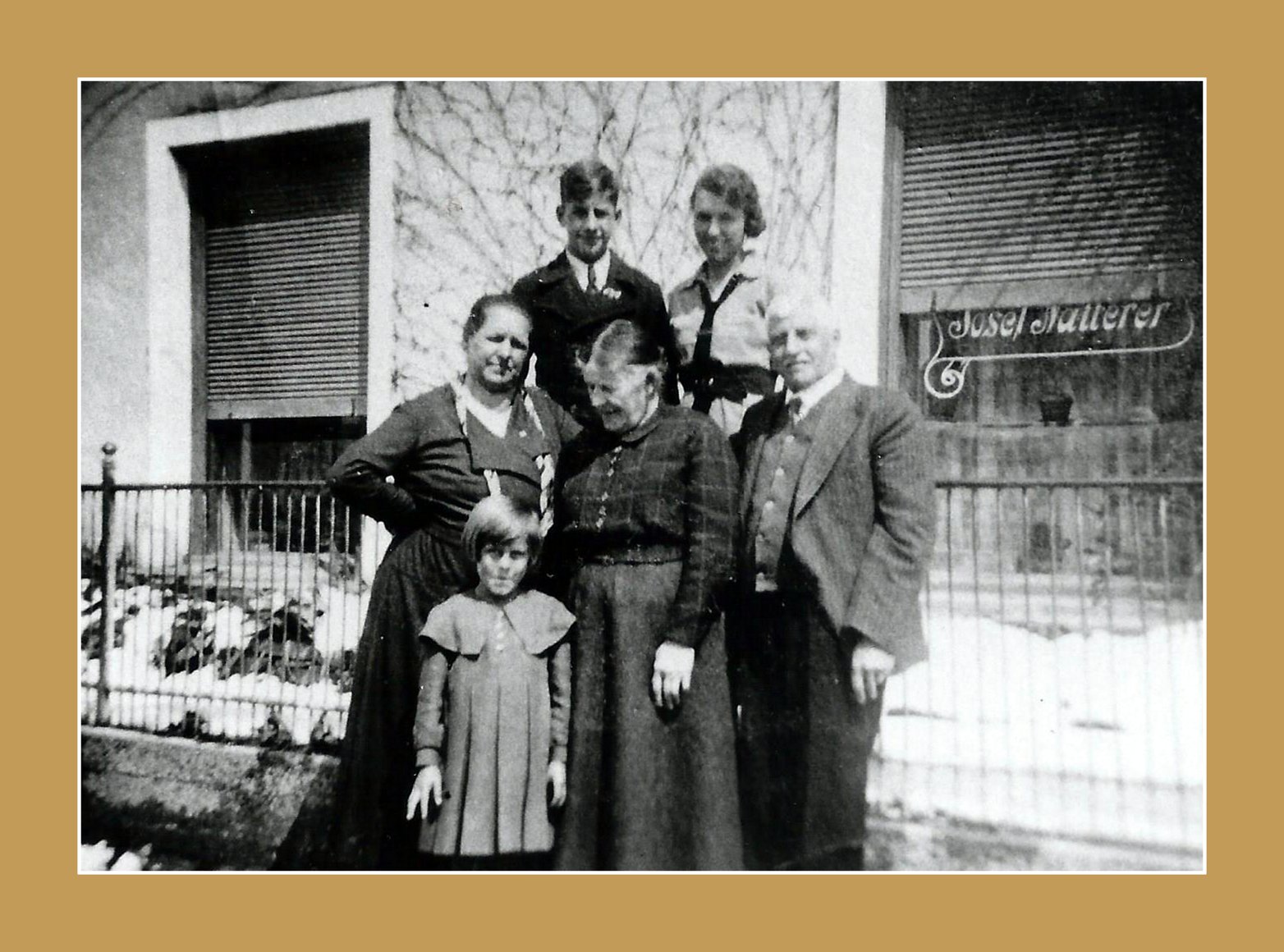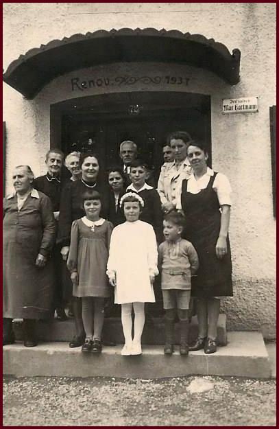 - 1943 Erstkommuniontag. Am Eingang. Vorne die drei Hartmannkinder: Gusti, Elfriede und Max.