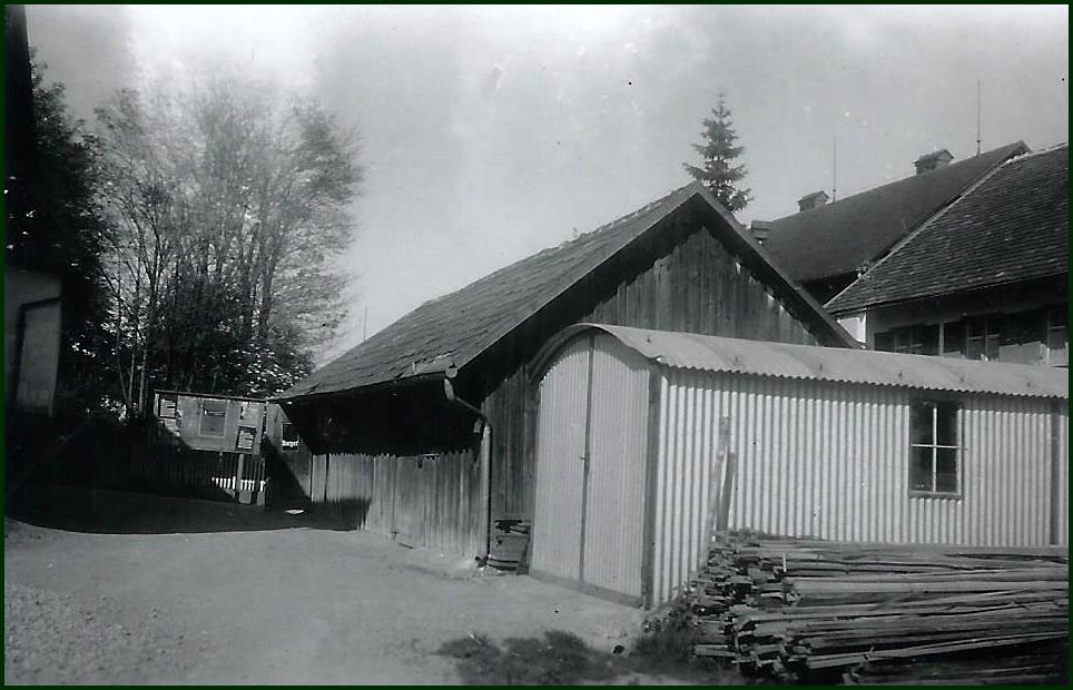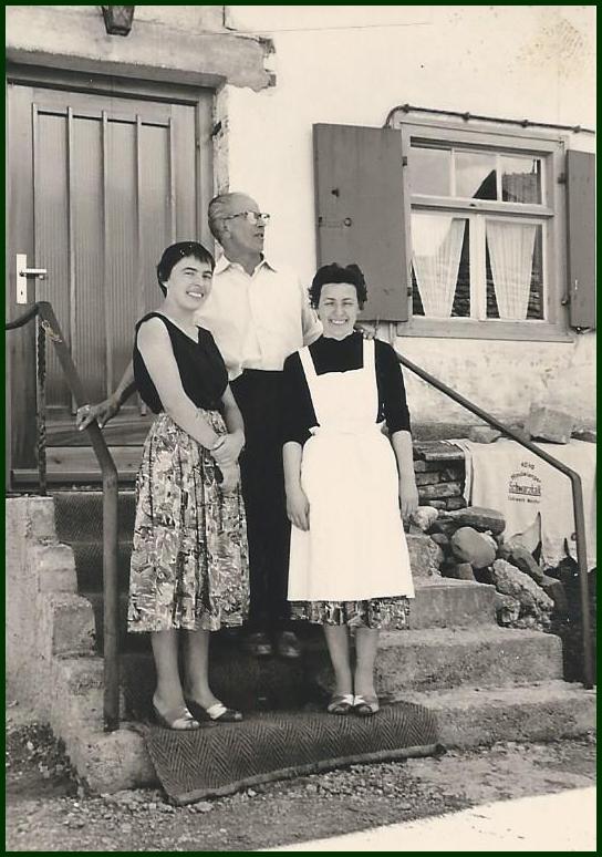 Vorderseite zur Kirchstraße anno 1937. Statt Autos parken Fahrräder. Bild 2: Im Gasthaus. 1954. Justine und Tochter Gusti.