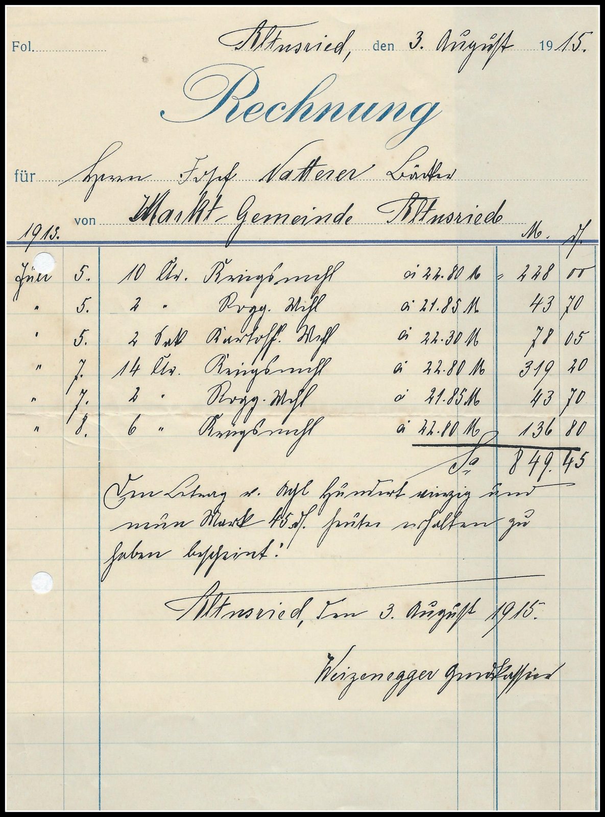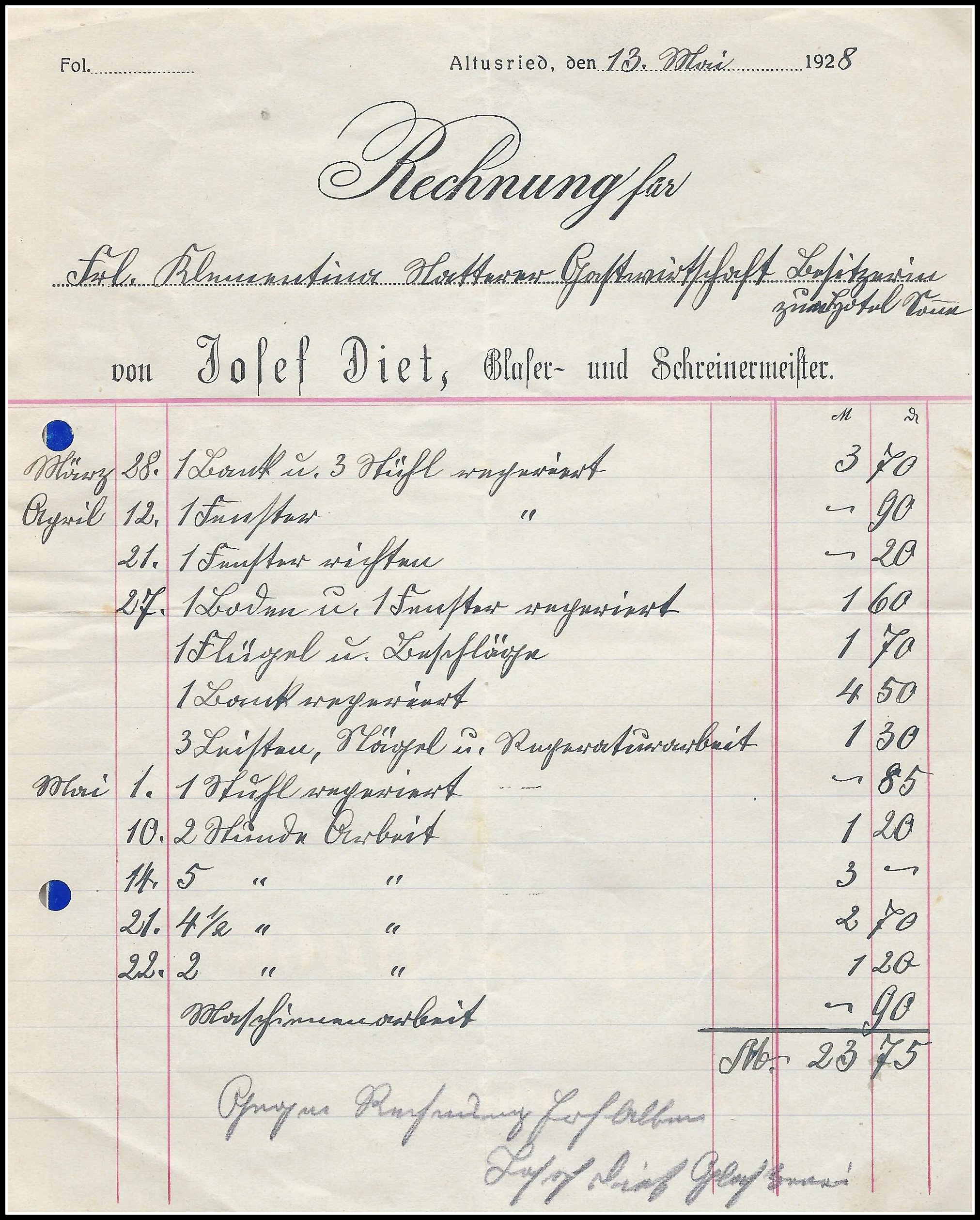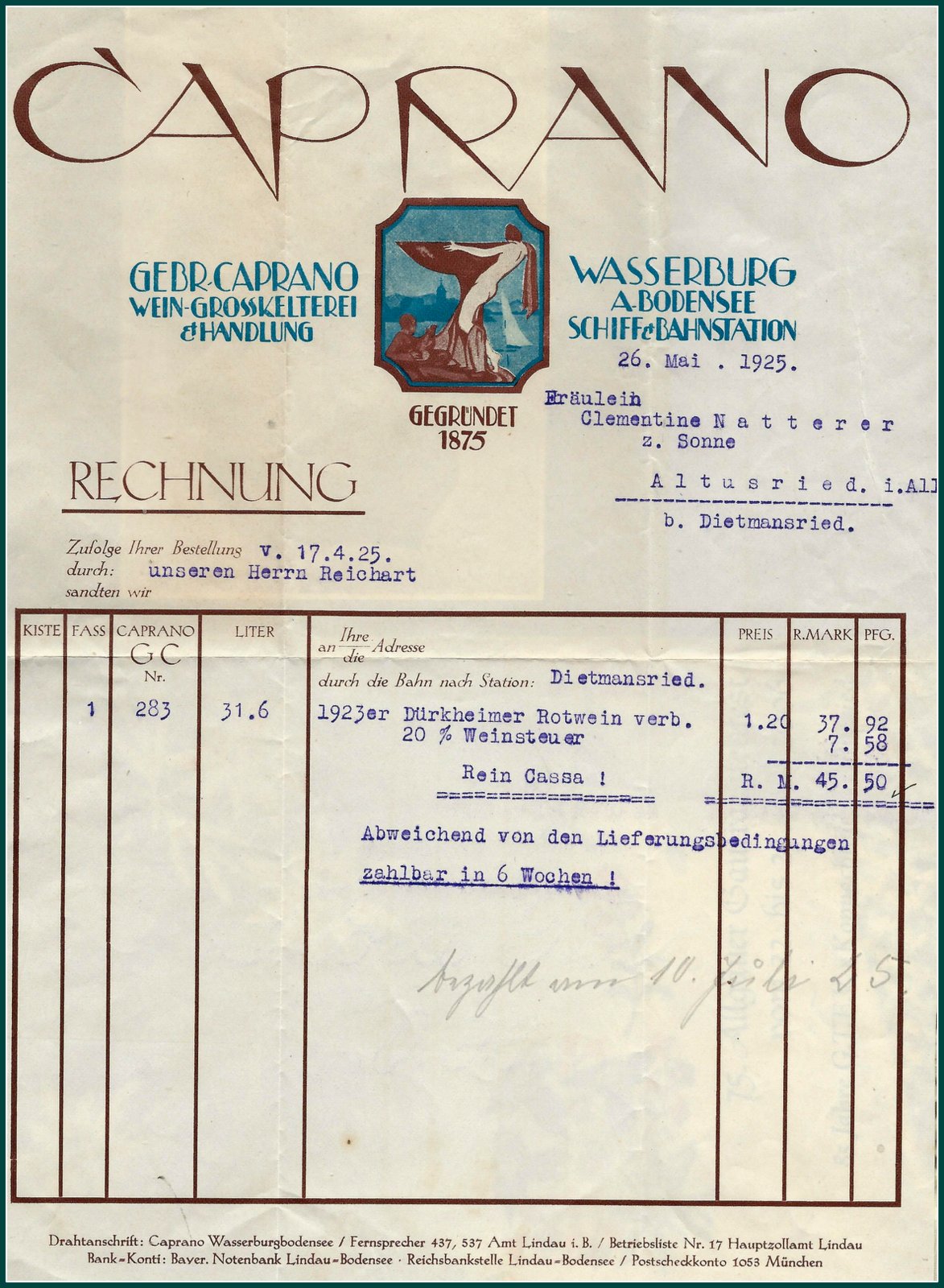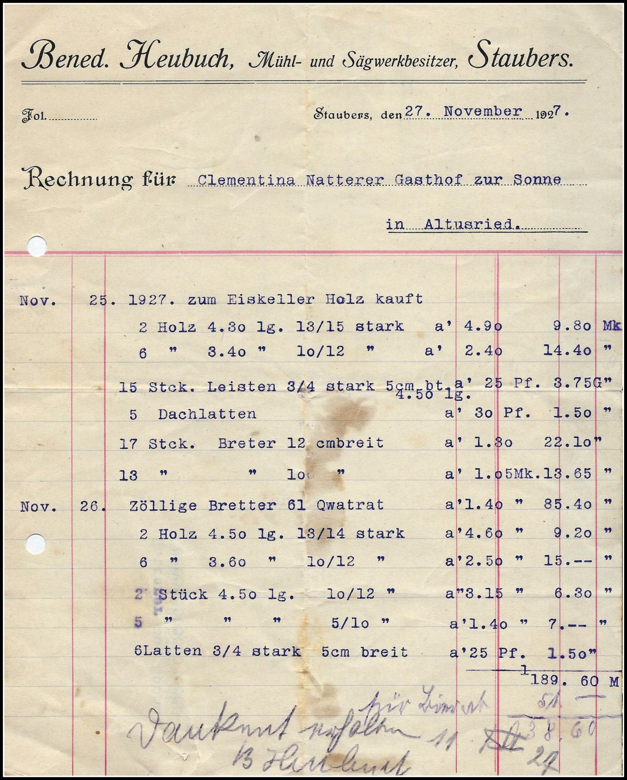 Alte Rechnungen aus den Zehner- und Zwanzigerjahren des vorigen Jahrhunderts, gestellt an Klementine Natterer, Gasthaus Sonne.